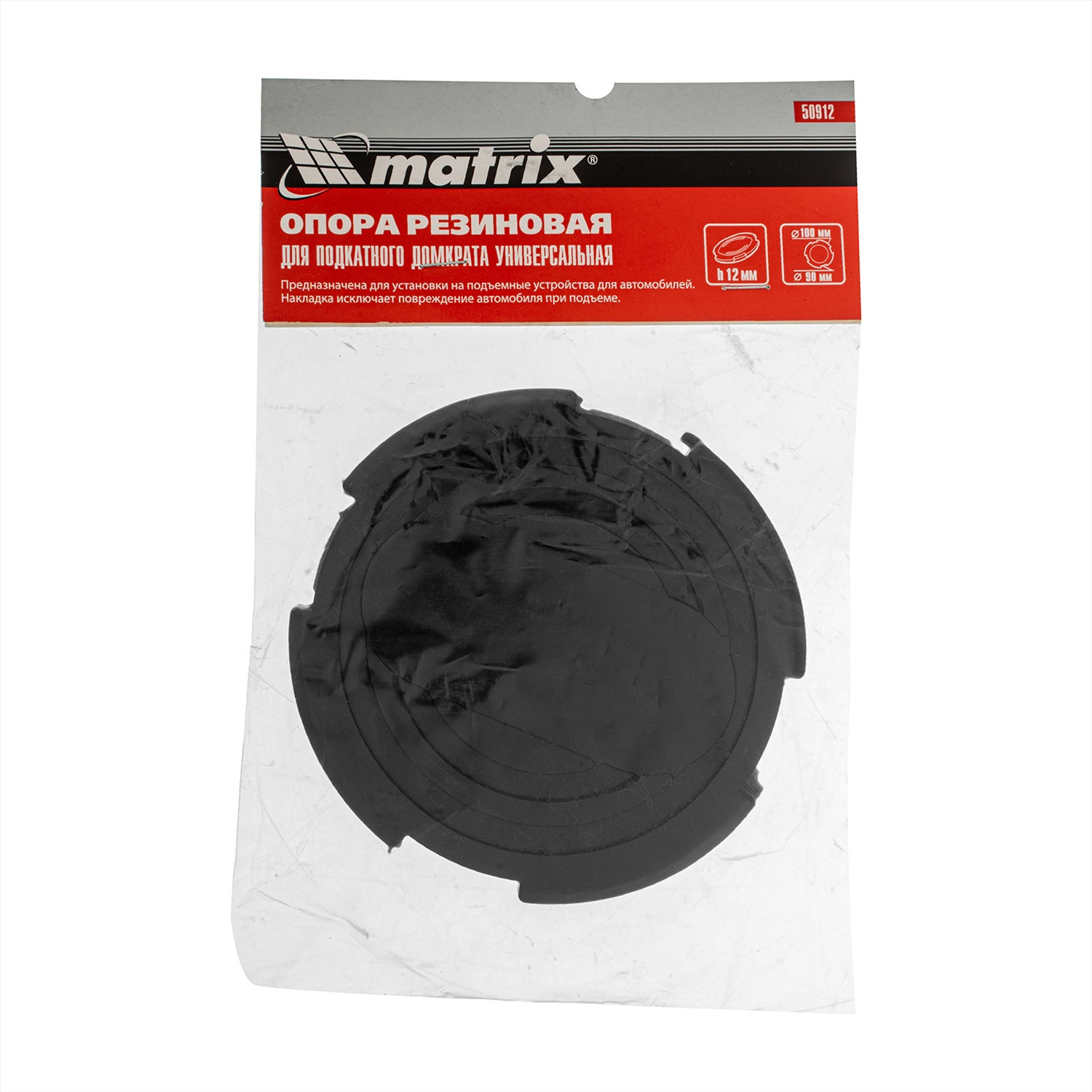 Универсальная резиновая опора Matrix 50912 диаметром 100/90 мм и толщиной 12 мм пригодится при использовании подкатного домкрата. Она надежно защищает корпус автомобиля и верхнюю опору подъемного устройства от механических повреждений. Рассчитана на эксплуатацию с моделями 51133, 51136, 51137. Преимущества