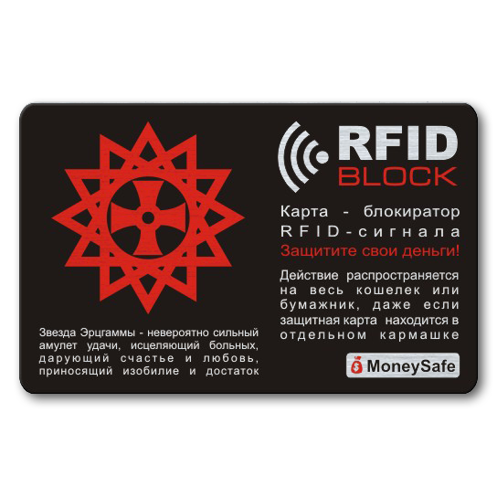 Карта из тонкого металла надёжно защитит средства на бесконтактных банковских картах. Действие распространяется на весь кошелек или бумажник, даже если защитная карта находится в отдельном кармашке.