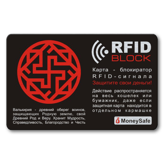 Карта из тонкого металла надёжно защитит средства на бесконтактных банковских картах. Действие распространяется на весь кошелек или бумажник, даже если защитная карта находится в отдельном кармашке.