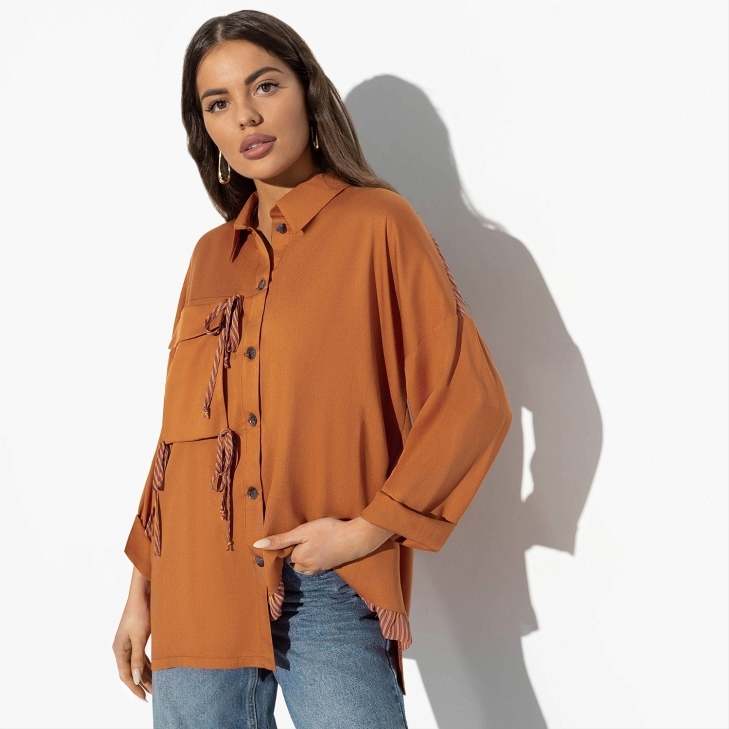 Принимай внезапное приглашение на кофе. Только накинь сверху рубашку ЧАРУТТИ. Благородный медный цвет, детали и расслабленный стиль придадут нужную атмосферу и следующий кофе будет уже в более романтичной обстановке. Рубашка из вискозы в комбинации тканей. Объемный акцентный карман, классический ворот. Асимметричный крой подола и рюша по одной стороне рубашки. Акцентная ткань в полоску на линии плеч сзади.