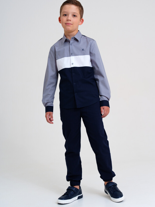 Рубашка с длинным рукавом застёгивается на классические кнопки, а воротник держит форму даже после многократных стирок. Серый, темно-синий и белый цвета делают её универсальной — её можно надеть и с жилетом, и под школьный пиджак из коллекции PlayToday, а также дополнить галстуком или бабочкой. Это не просто школьная рубашка — это база, с которой начинается любой продуманный образ.