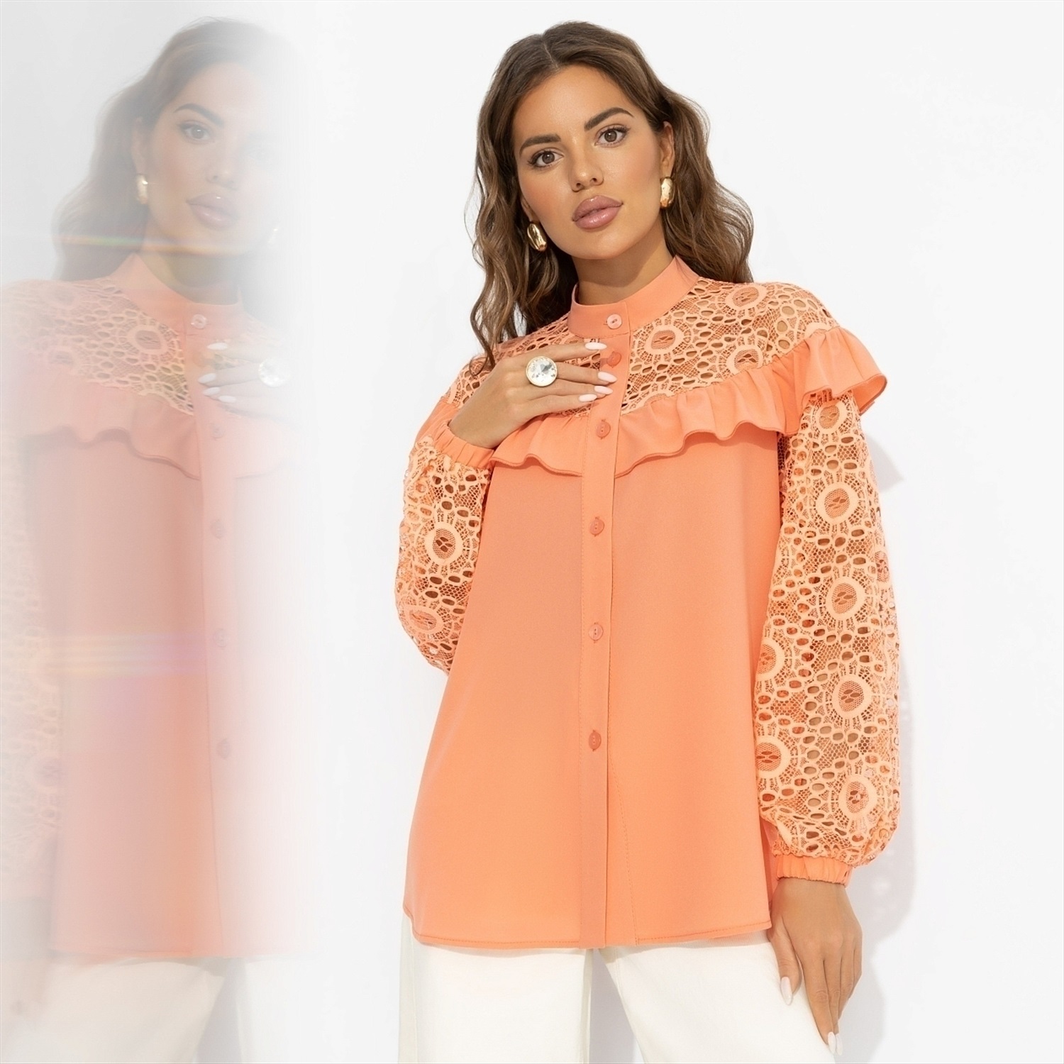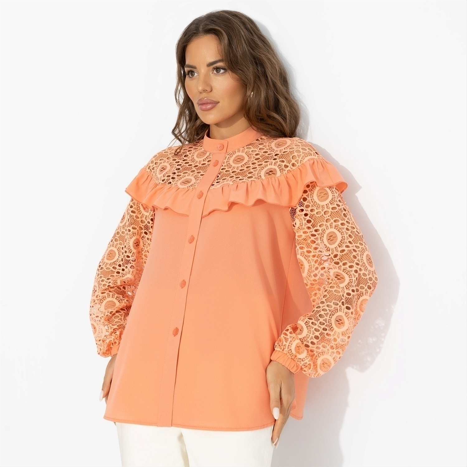 ТН ВЭД: 6206400000; Состав: Блузочная ткань «креп-шифон», кружево (98% п/э, 2% спандекс); Плотность ткани: Тонкая; Тип ткани: Трикотаж, текстиль; Вид застежки: Пуговица/-ы; Декоративные элементы: Рюши; Карманы: Нет; Основной цвет ткани: Оранжевый; Отрезная талия: Нет; Подклад: Нет; Резинка по талии: Нет; Рисунок/раппорт: Нет, все изделия идентичны; Сезон: Круглогодичный; Силуэт: Свободный; Стиль: Повседневный