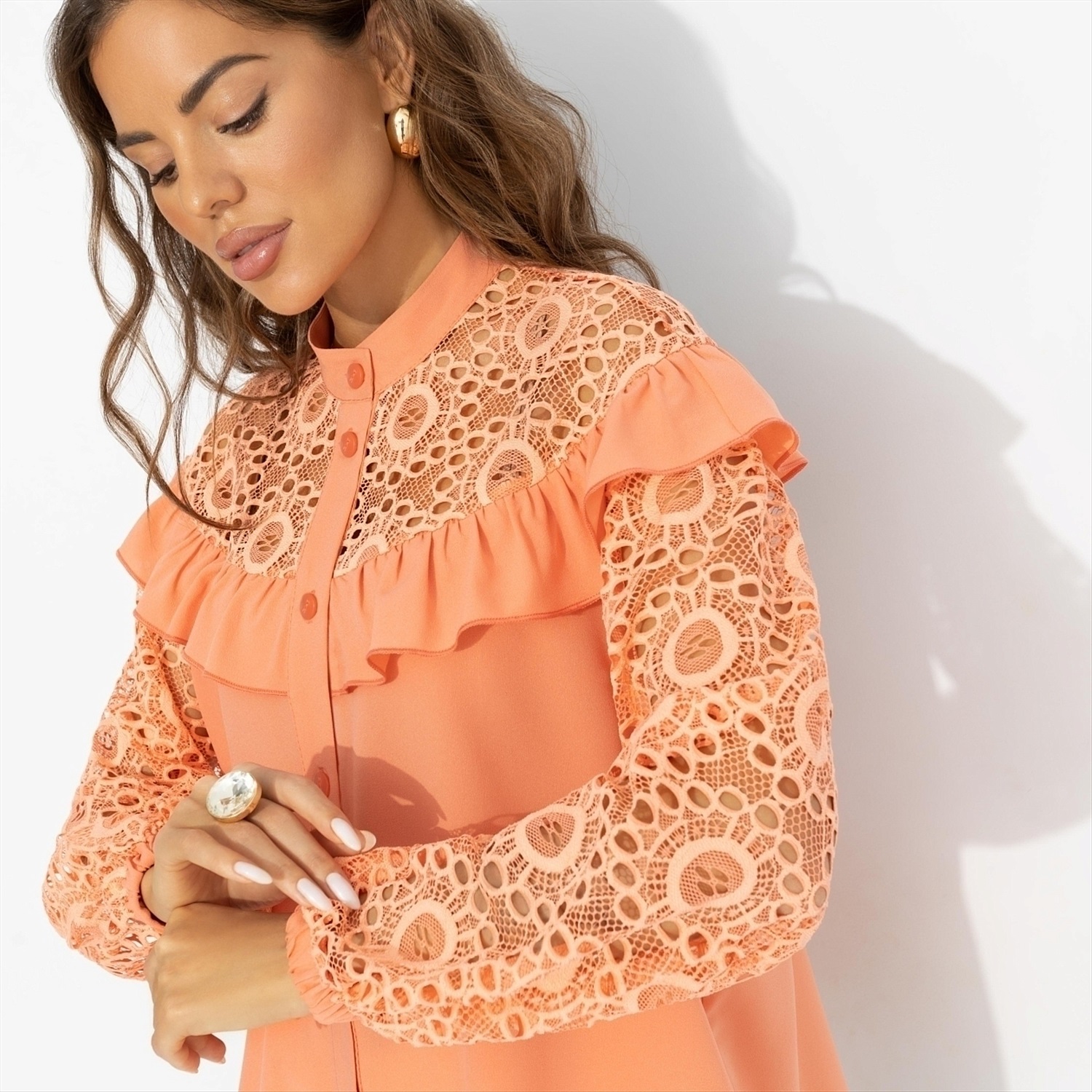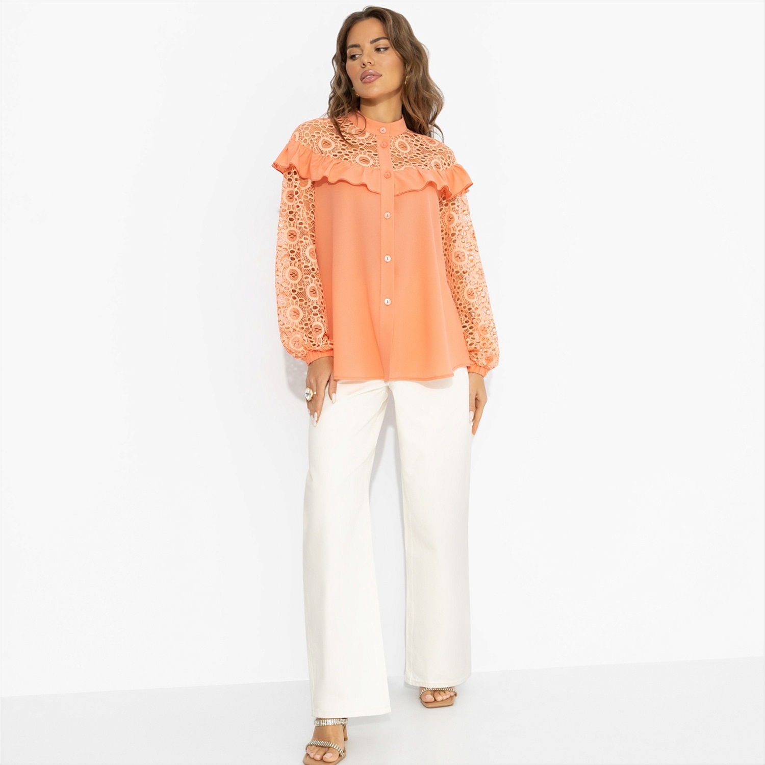 Героиня этого образа – девушка непростая. Загородный дом, собака, друзья по выходным и мужчина, который влюблён в её смех. Оранжево-персиковая рубашка с кружевом – её форма для идеального дня: утром они пьют кофе на веранде, днём мчатся по делам в город, а вечером встречают закат на крытой террасе под гирляндами огней. Удлинённая рубашка с кружевной кокеткой и рукавами создаёт образ современной леди. Воланы по плечам и свободный крой легко вписываются в любой гардероб – с джинсами, брючным костюмом или лёгкой юбкой. Носите в заправленном виде или навыпуск.