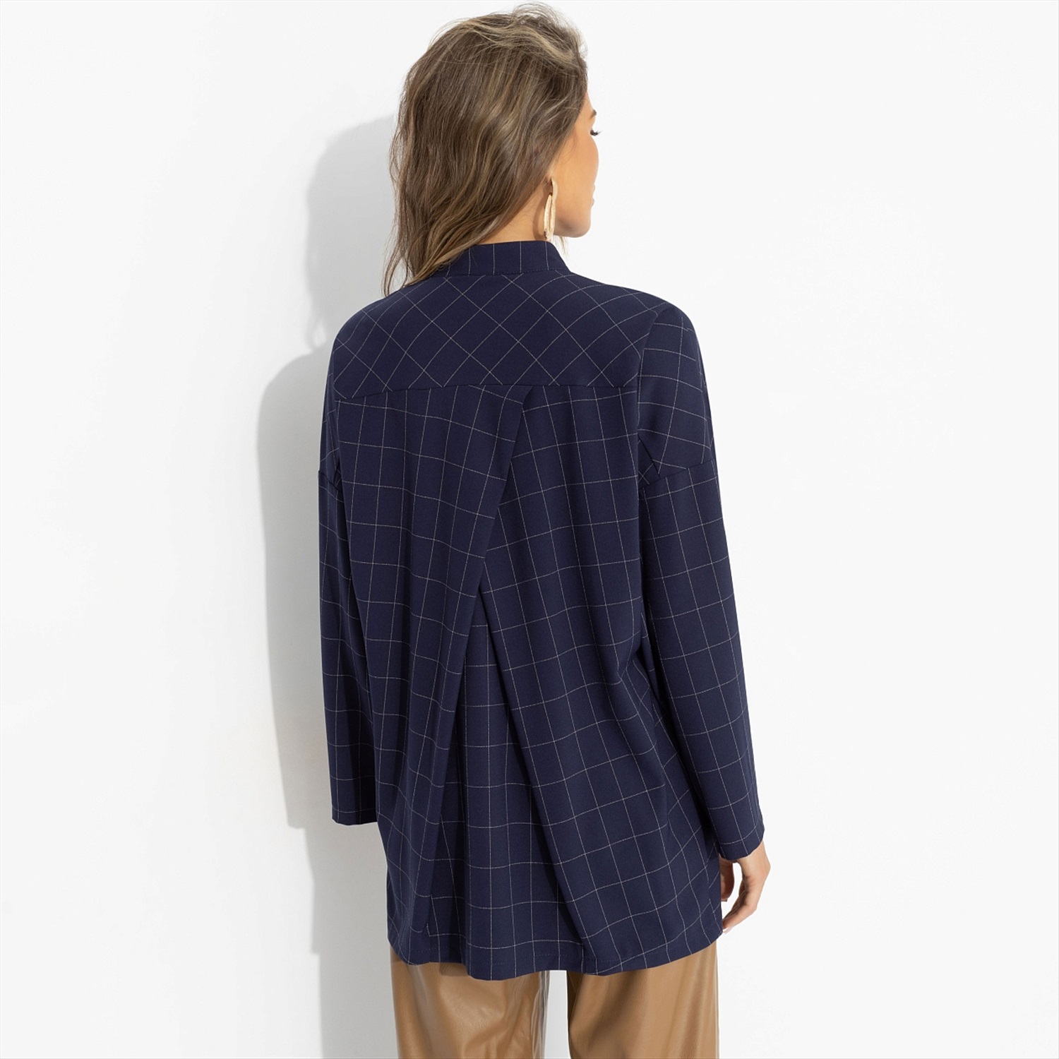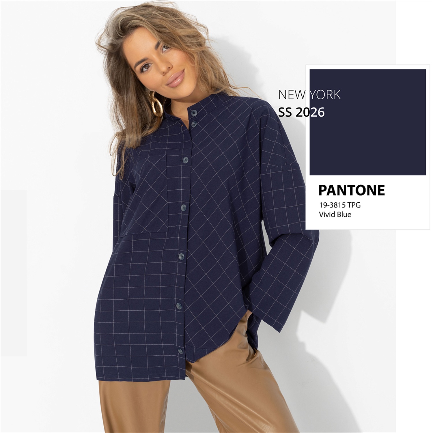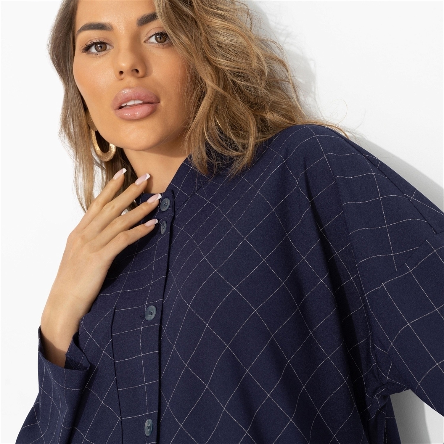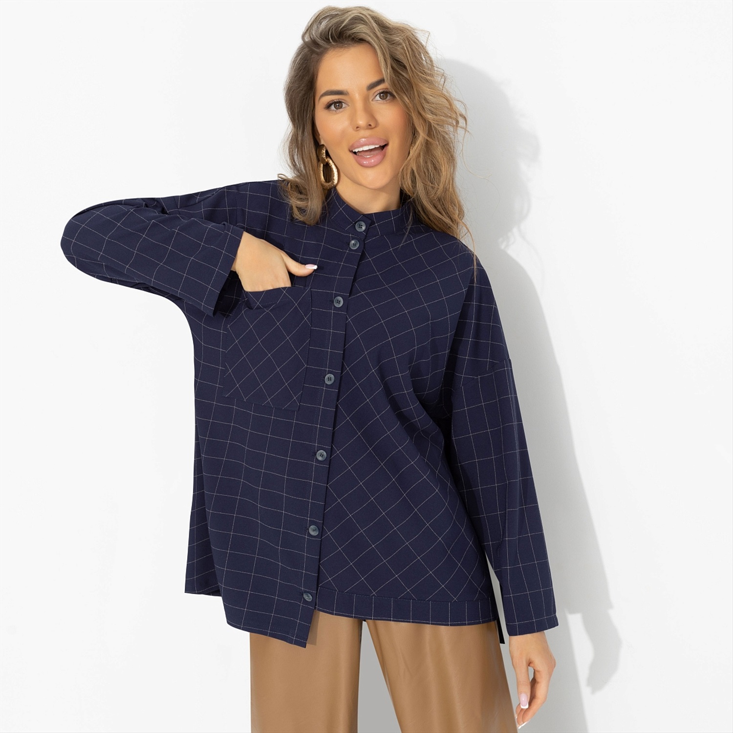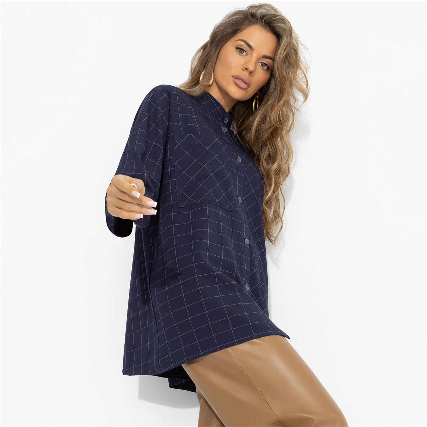 ТН ВЭД: 6206400000; Состав: «Креп булгари» (96% п/э, 4% спандекс); Плотность ткани: Средняя; Тип ткани: Текстиль; Вид застежки: Пуговица/-ы; Декоративные элементы: Складки; Дополнительный цвет ткани: Белый; Карманы: Накладные; Основной цвет ткани: Синий; Отрезная талия: Нет; Подклад: Нет; Резинка по талии: Нет; Рисунок/раппорт: Нет, все изделия идентичны; Сезон: Круглогодичный; Силуэт: Свободный; Стиль: Повседневный