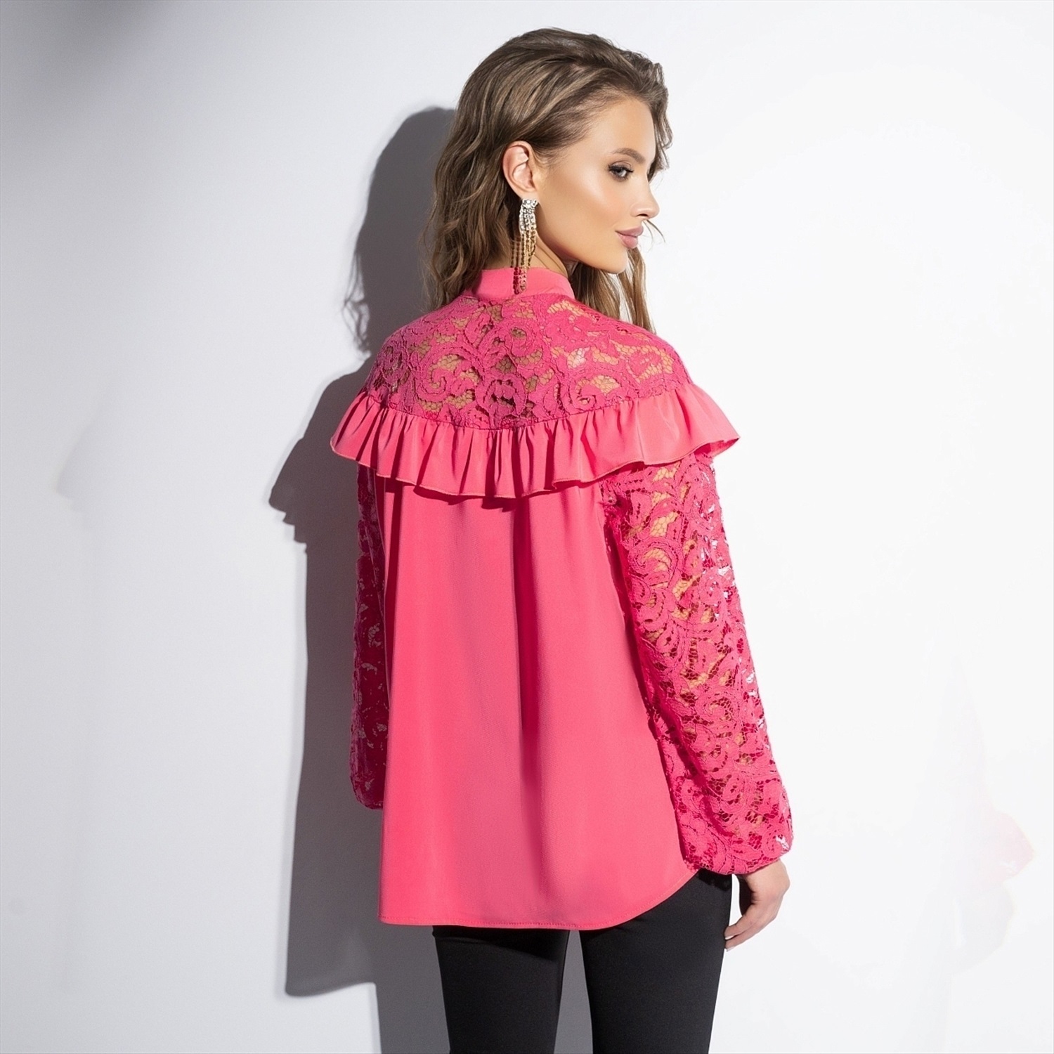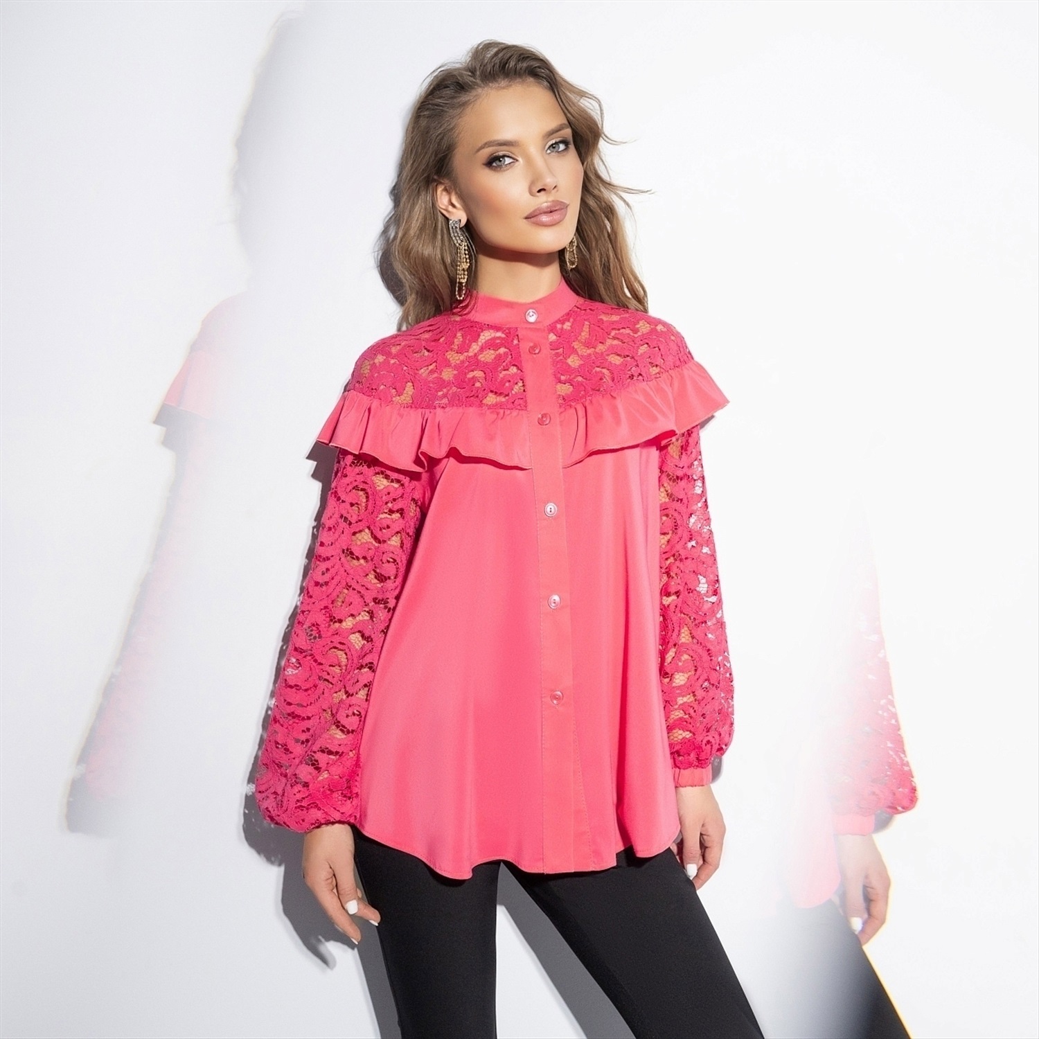 ТН ВЭД: 6206400000; Состав: Шифон, кружево (98% п/э, 2% спандекс); Плотность ткани: Тонкая; Тип ткани: Трикотаж, текстиль; Вид застежки: Пуговица/-ы; Декоративные элементы: Рюши; Карманы: Нет; Основной цвет ткани: Розовый; Отрезная талия: Нет; Подклад: Нет; Резинка по талии: Нет; Рисунок/раппорт: Нет, все изделия идентичны; Сезон: Круглогодичный; Силуэт: Свободный; Стиль: Повседневный