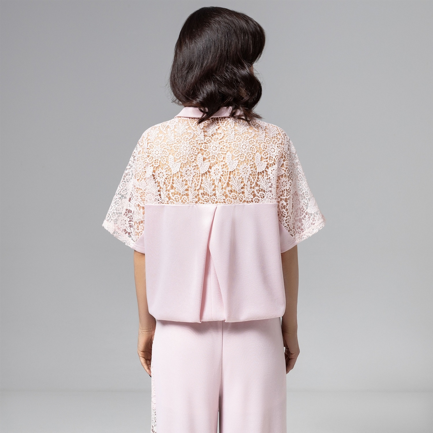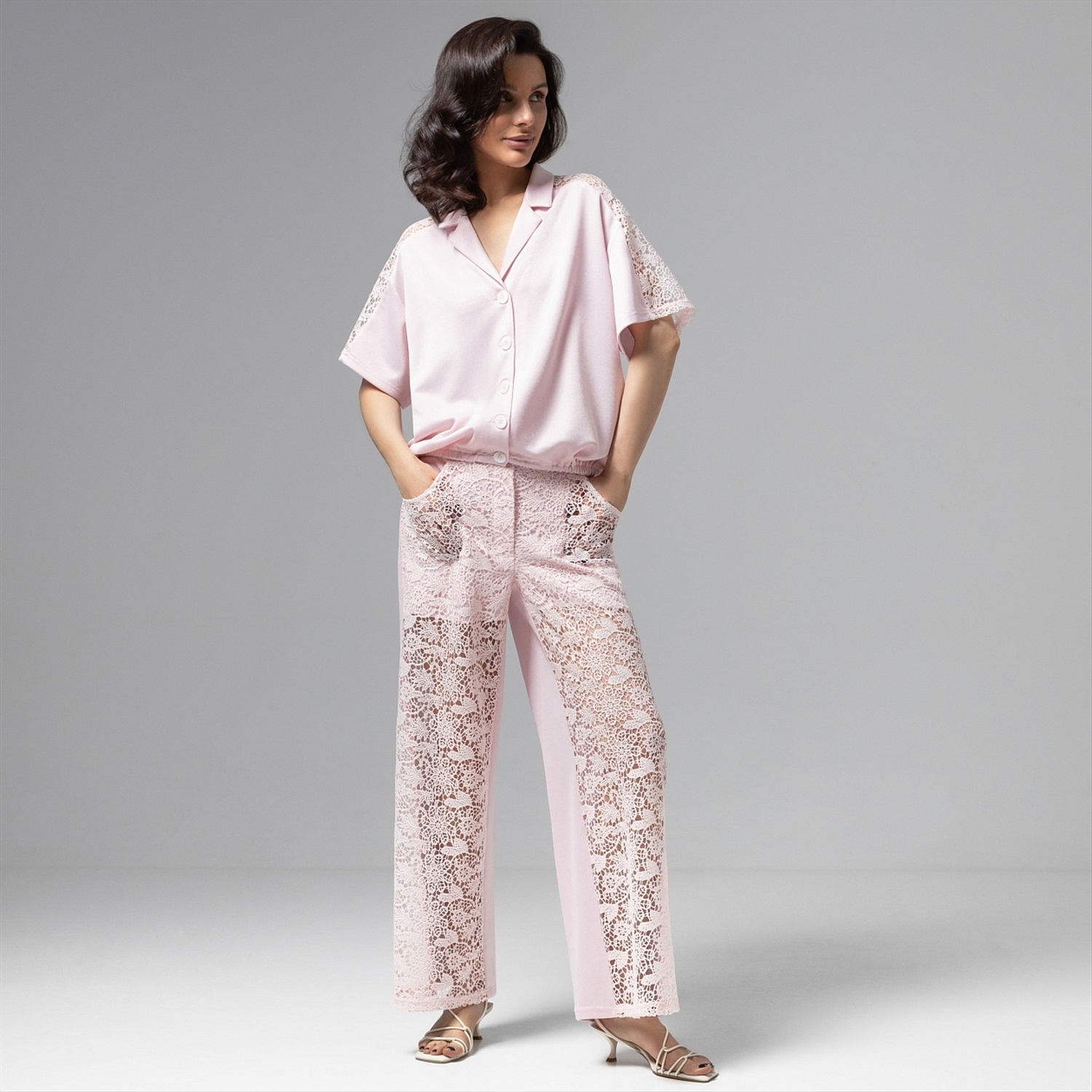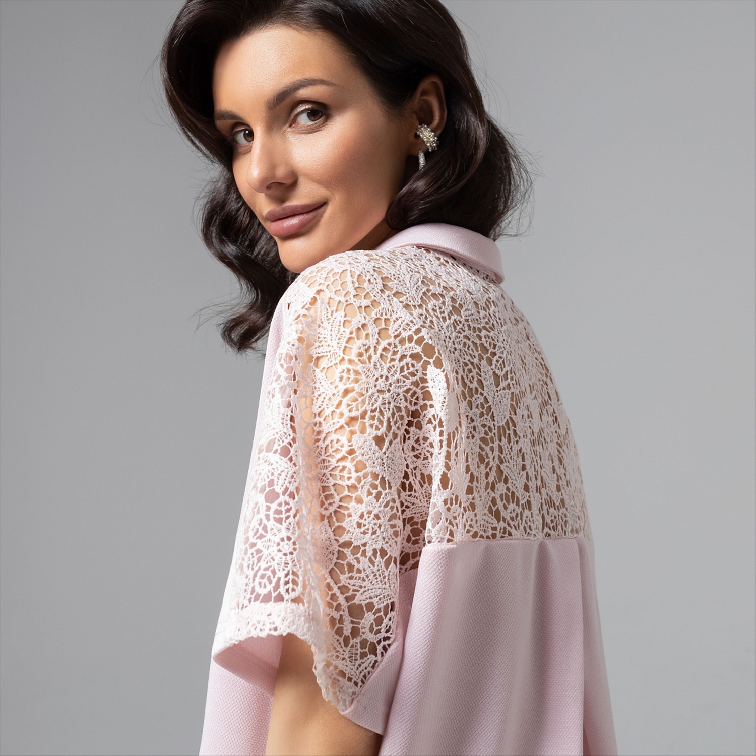 ТН ВЭД: 6206400000; Состав: Трикотаж жаккард, кружево (65% п/э, 30% вискоза, 5% спандекс); Плотность ткани: Средняя; Тип ткани: Трикотаж; Вид застежки: Пуговица/-ы; Дополнительный цвет ткани: Розовый; Карманы: Нет; Основной цвет ткани: Розовый; Отрезная талия: Нет; Рисунок/раппорт: Нет, все изделия идентичны; Сезон: Лето; Силуэт: Свободный; Стиль: Нарядный