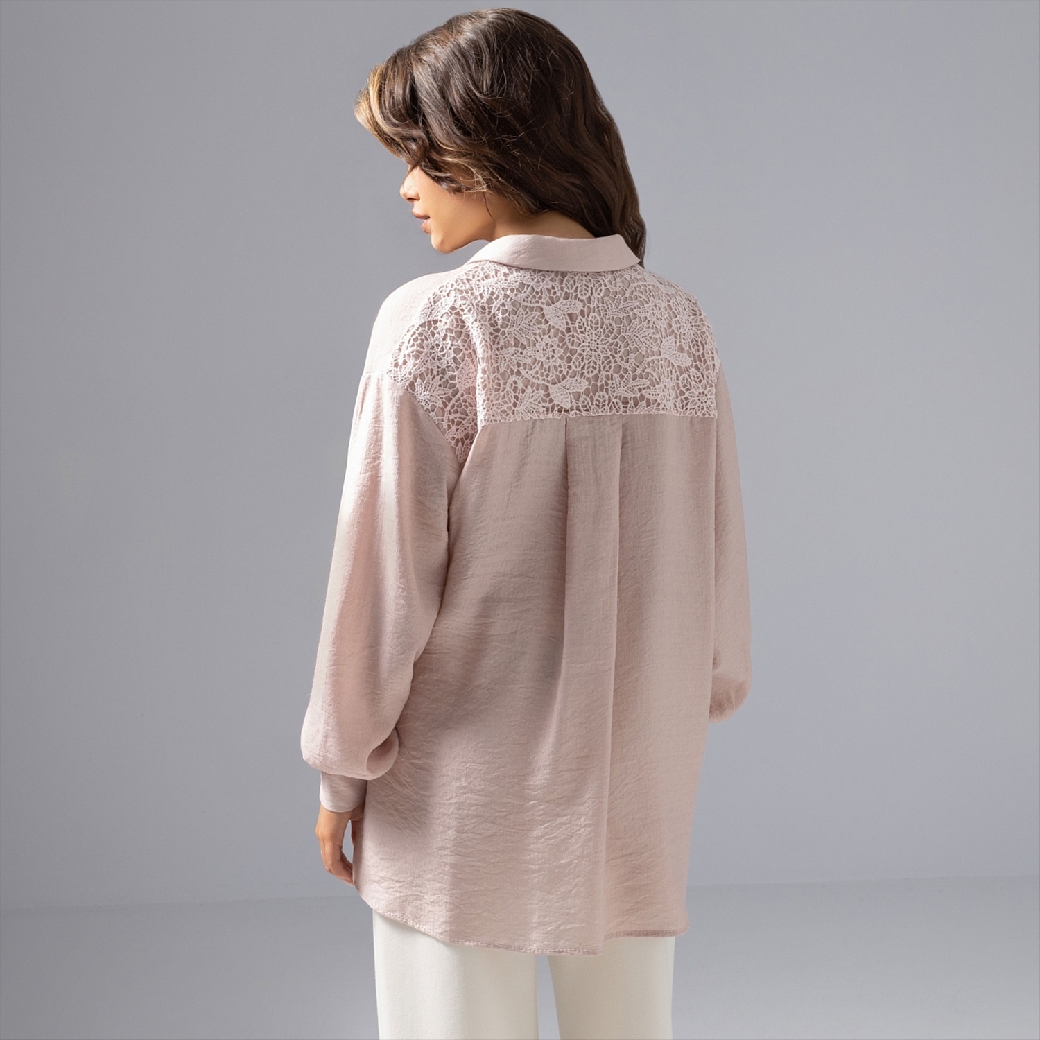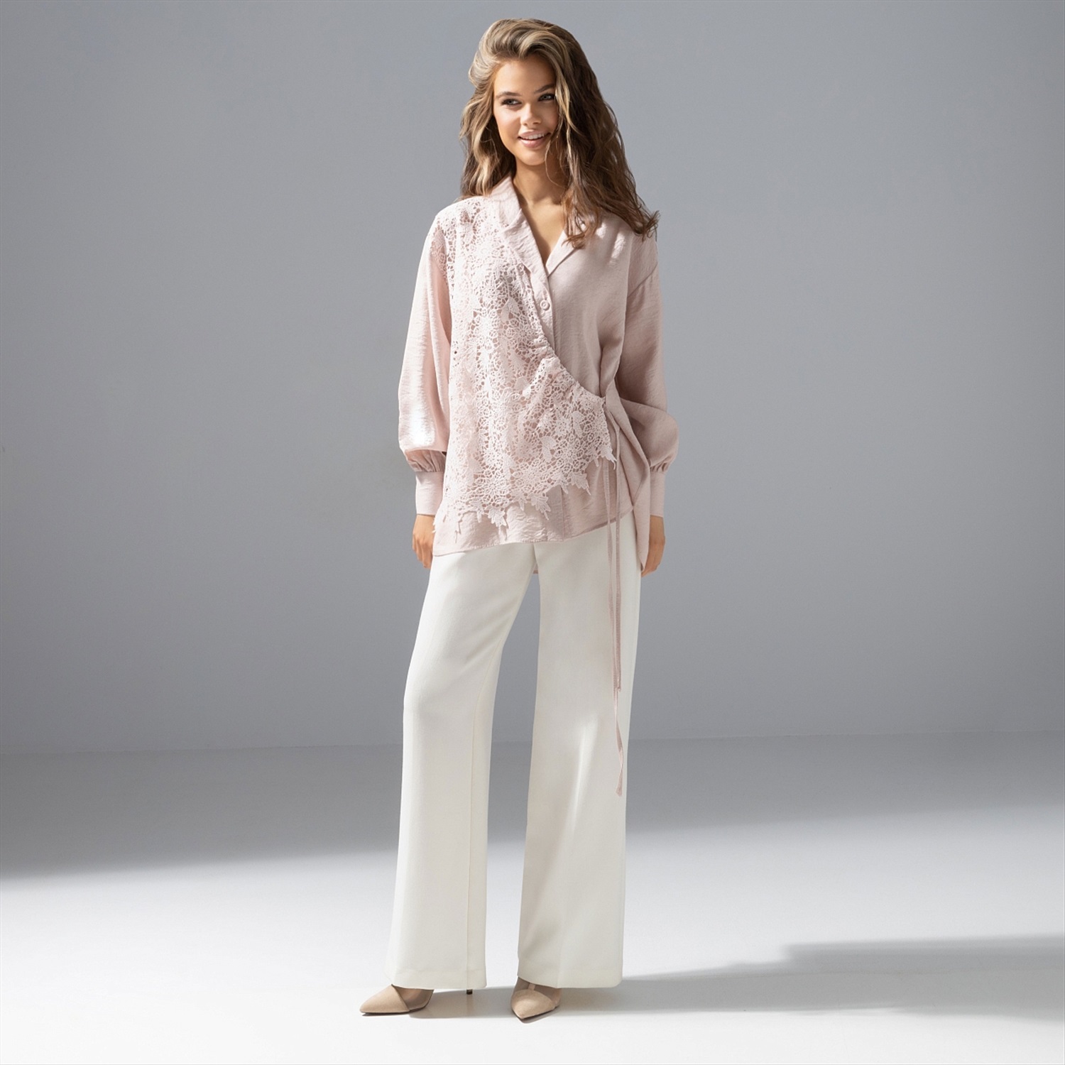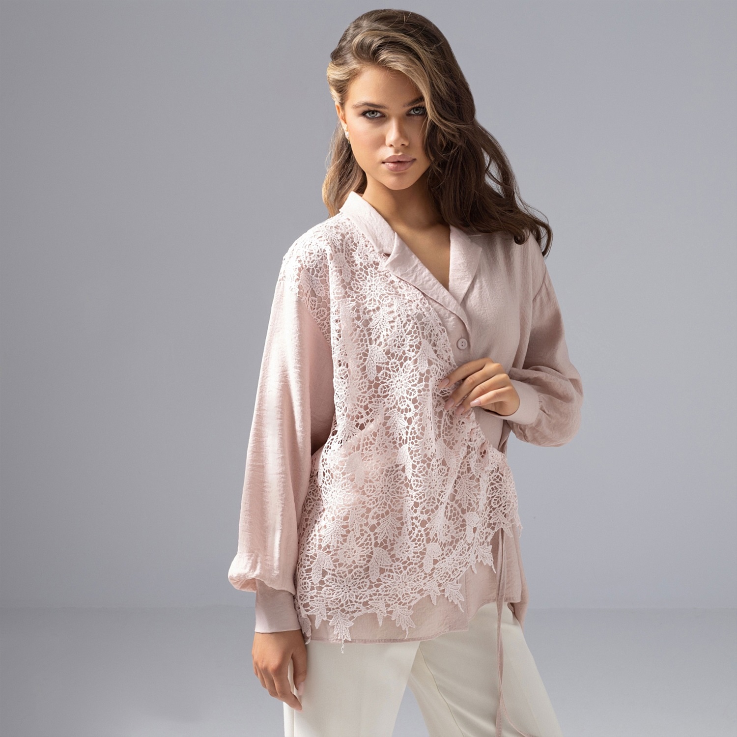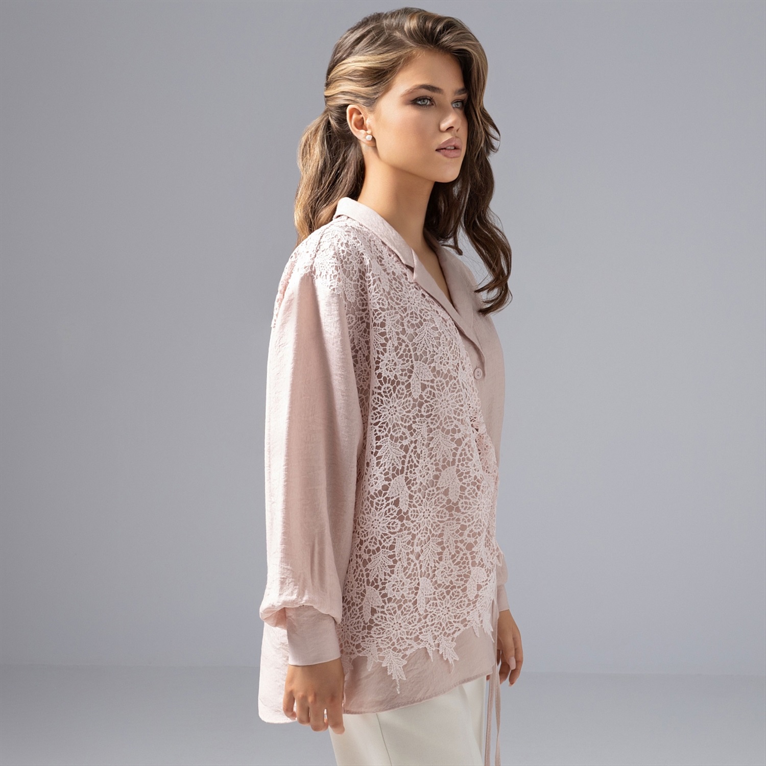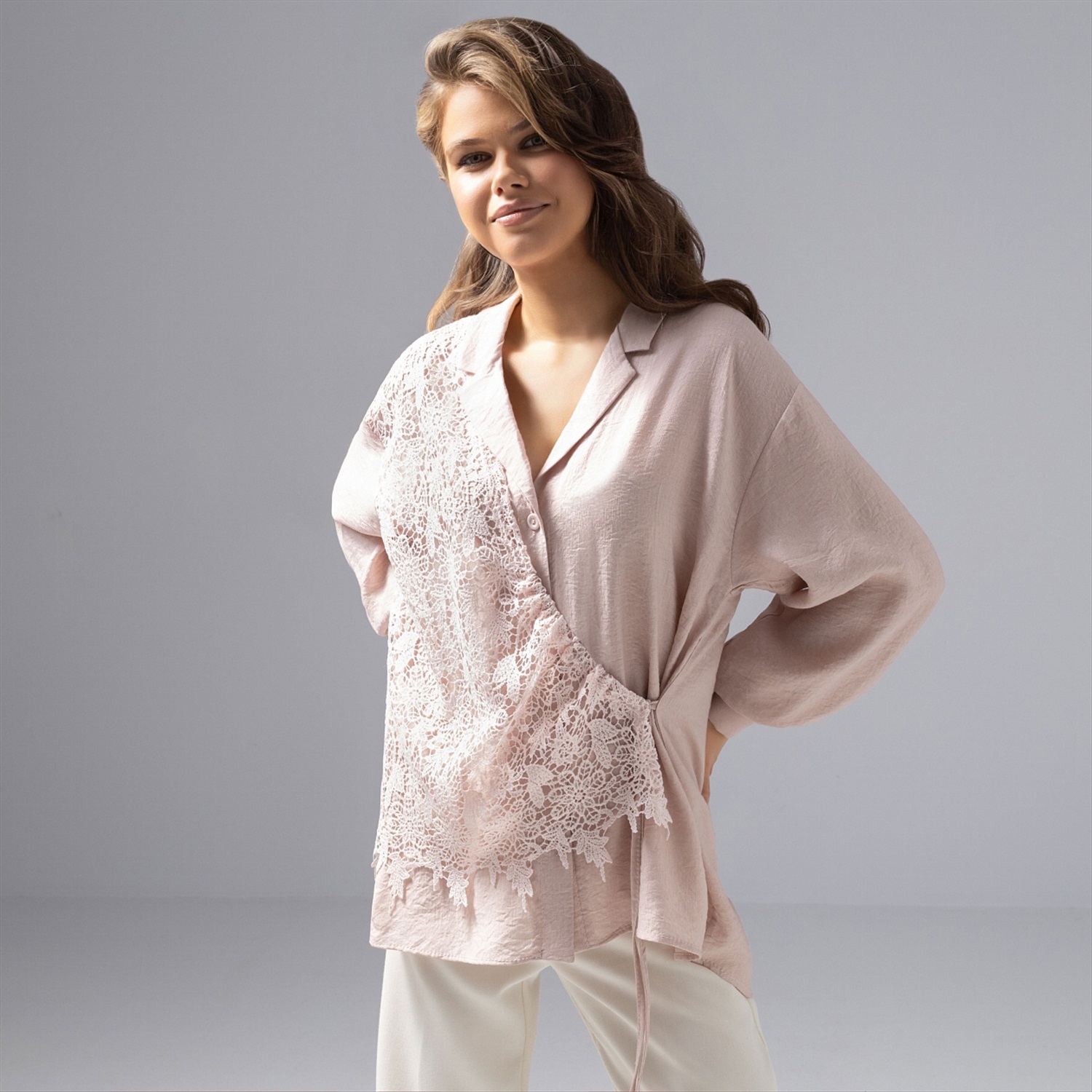 Если бы Мэттью Уильямс из Givenchy творил для ЧАРУТТИ, он бы сочетал пастель и причудливое кружево именно так: мягкость, асимметрия, акцент на фактуру. Не удивляйтесь, если получите комплимент от фэшн-эксперта – такую рубашку оценили бы стилисты со всего мира. Рубашка из премиальной блузочной ткани «фаби», воздушное сочетание 50% вискозы, хлопка и нейлона. Выразительное кружево и сложный продуманный крой способны преобразить образ за секунду. Для любительниц продуманной и нескучной элегантности.