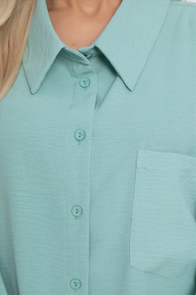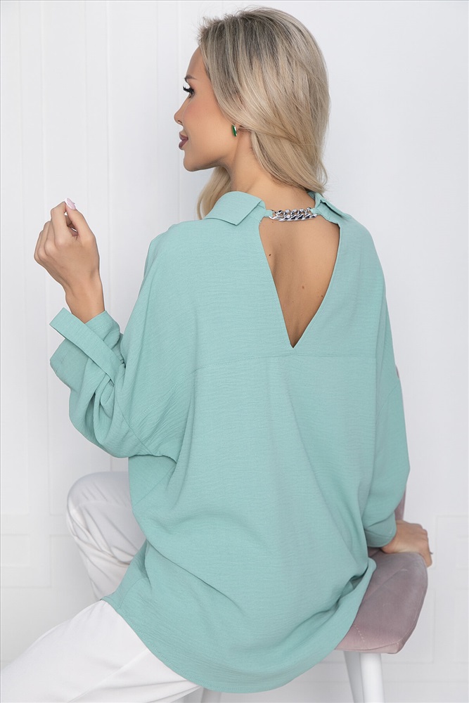 Лёгкая рубашка свободного кроя с акцентной спинкой. Классический отложной воротник по переду, по спинке украшен цепочкой серебряного цвета. Рукав втачной, 3/4, на пате. Такая рубашка подойдёт для создания стильного летнего образа и будет гармонично смотреться в сочетаниях с джинсами, шортами и брюками.