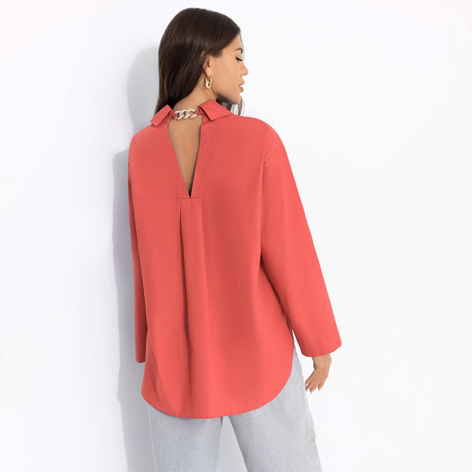 На вид – рубашка. На деле – манифест независимости и хорошего вкуса. Спинка подскажет: характер – не в фасоне, а в подходе. Рубашка свободного кроя. Акцент в виде металлической цепи со стразами по спинке изделия. Есть треугольный вырез на спинке. Рубашка хорошо пропускает воздух за счет качественного материала и свободной посадки. Есть карман на передней стороне изделия.