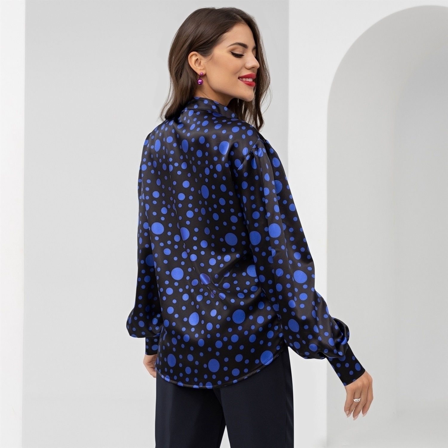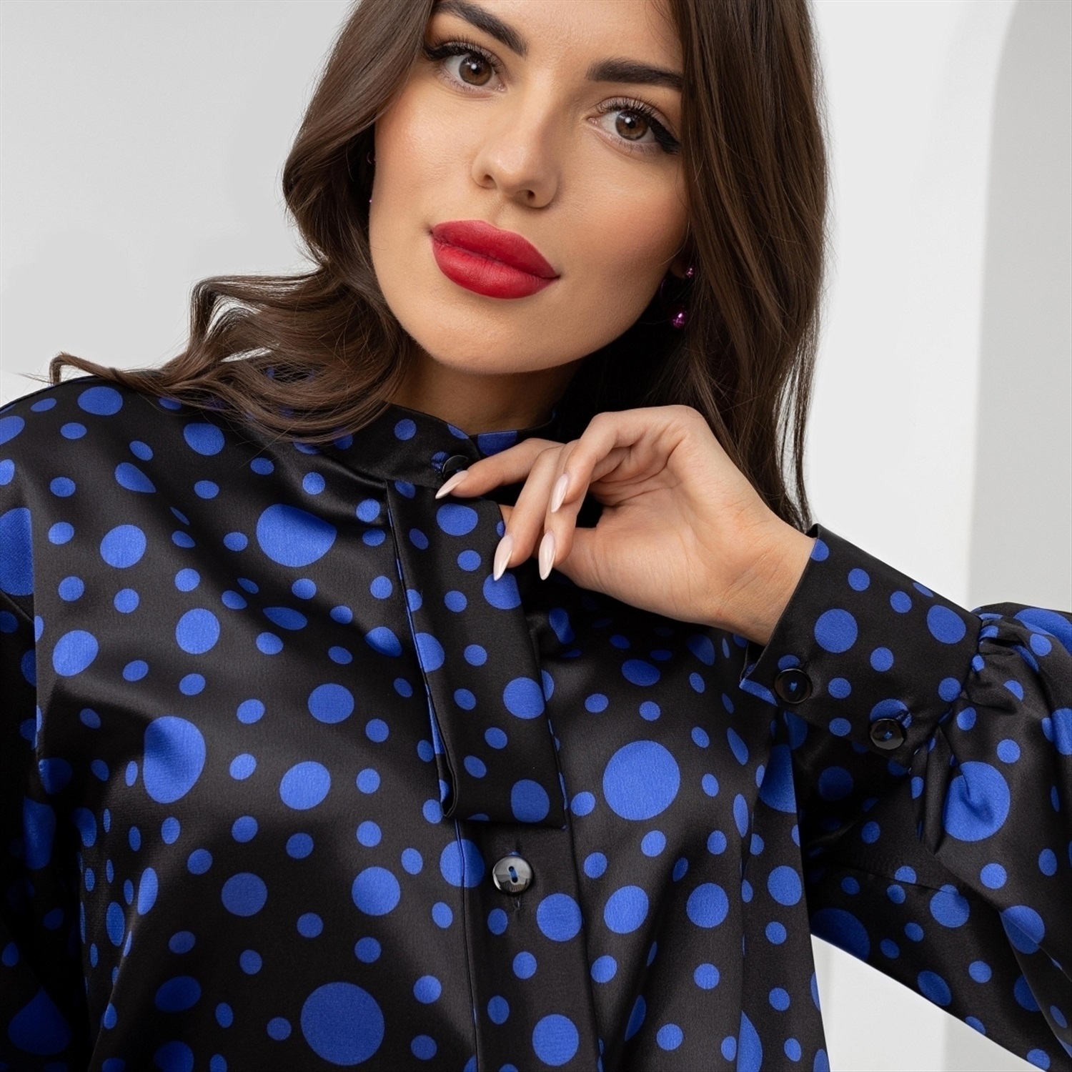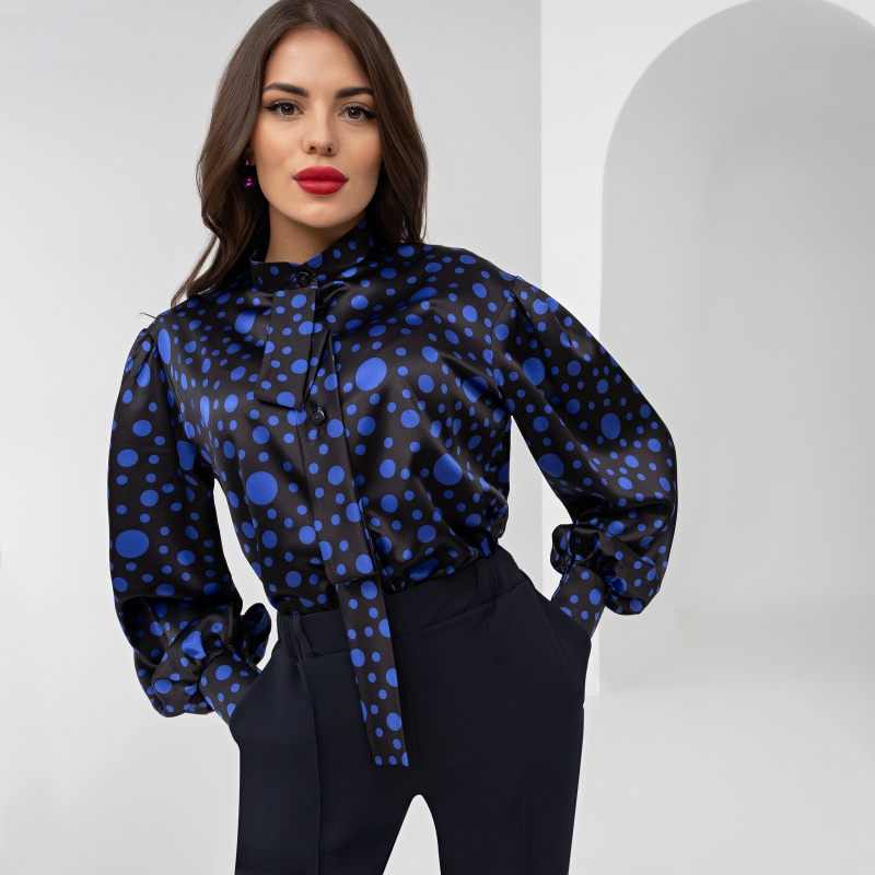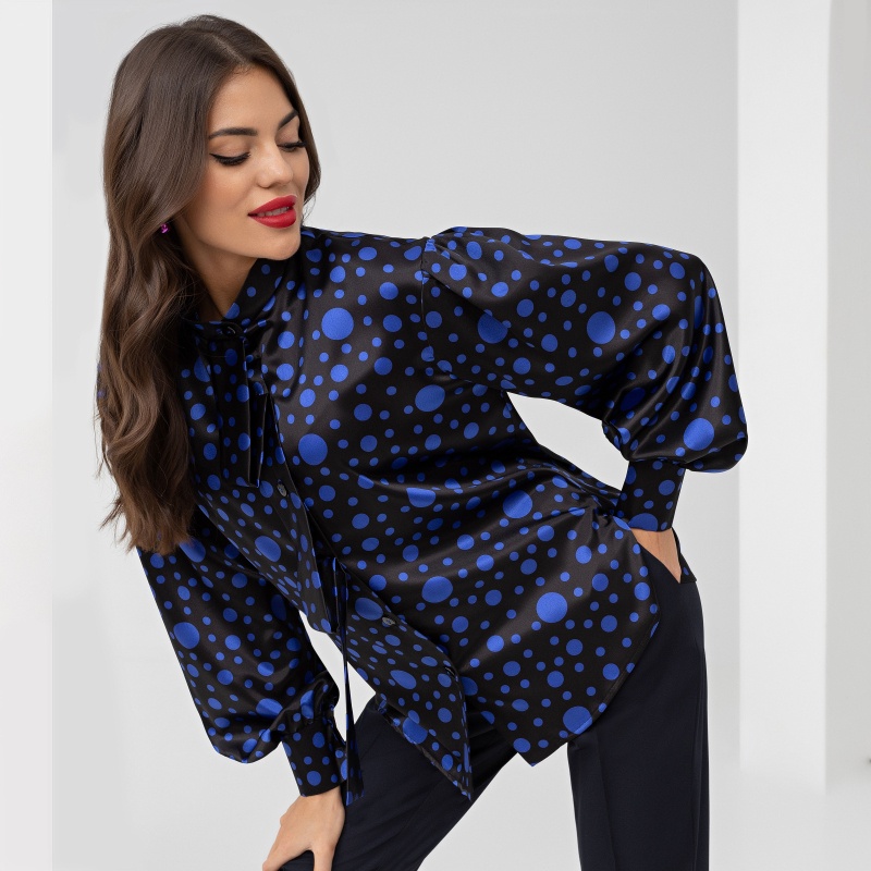 Состав: «Атлас стрейч» (95% п/э, 5% спандекс) Плотность ткани: Средняя Тип ткани: Текстиль Длина: Макси Дополнительный цвет ткани: Синий Воротник: Стойка Карманы: Нет Основной цвет ткани: Черный Отрезная талия: Нет Подклад: Нет Резинка по талии: Нет Рисунок/раппорт: Нет, все изделия идентичны Вид принта: Горох Сезон: Круглогодичный Акцентные плечи, яркий принт, космическая фактура. Стильная рубашка с воротником галстуком, впишется в гардероб любой девушки. Будь в тренде, Любуйся в зеркало уже сейчас! Комментарии к товару