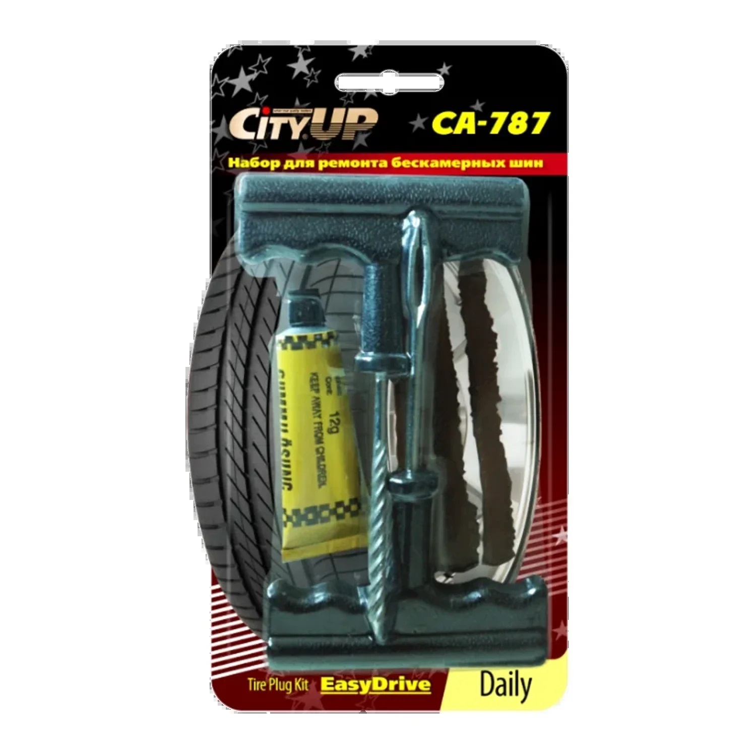набор для ремонта бескамерных шин. В набор входят шило - рашпиль, аппликатор жгута, эластичные жгуты, клей.
