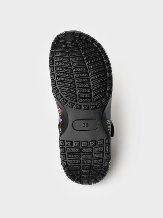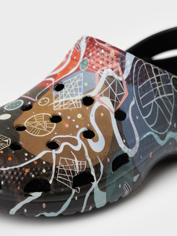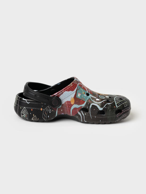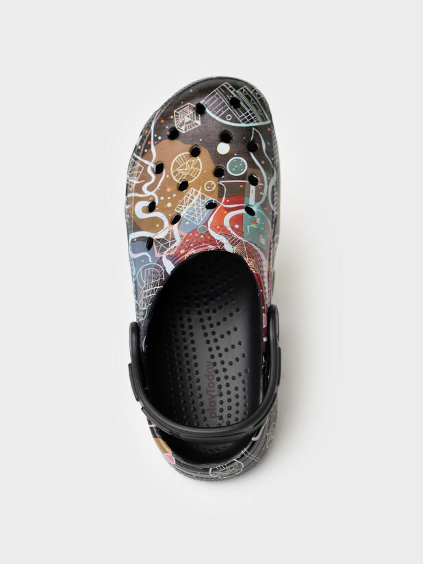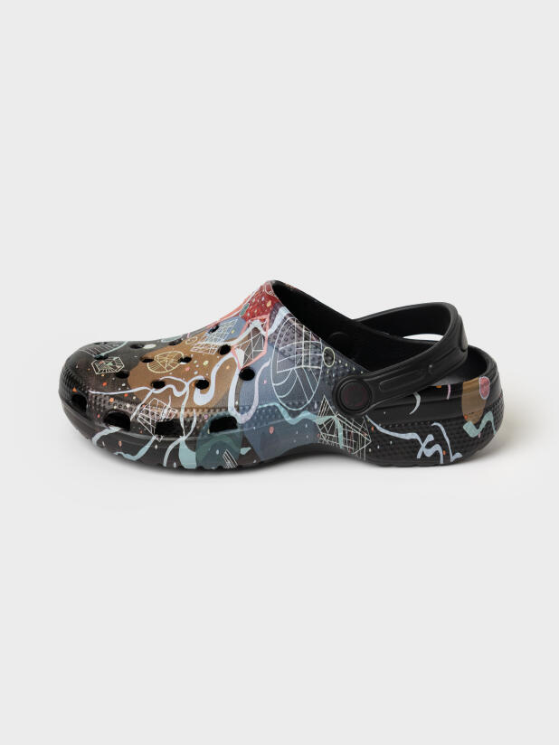 Сабо для девочки. Сабо из облегченного и прочного ЭВА с принтом фрагмента картины Василия Кандинского, Движение, 1935. Материал хорошо моется. Форма модели учитывает эргономику стопы. Модель имеет перекидной ремешок для лучшей фиксации обуви на ноге.