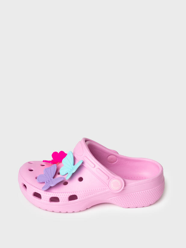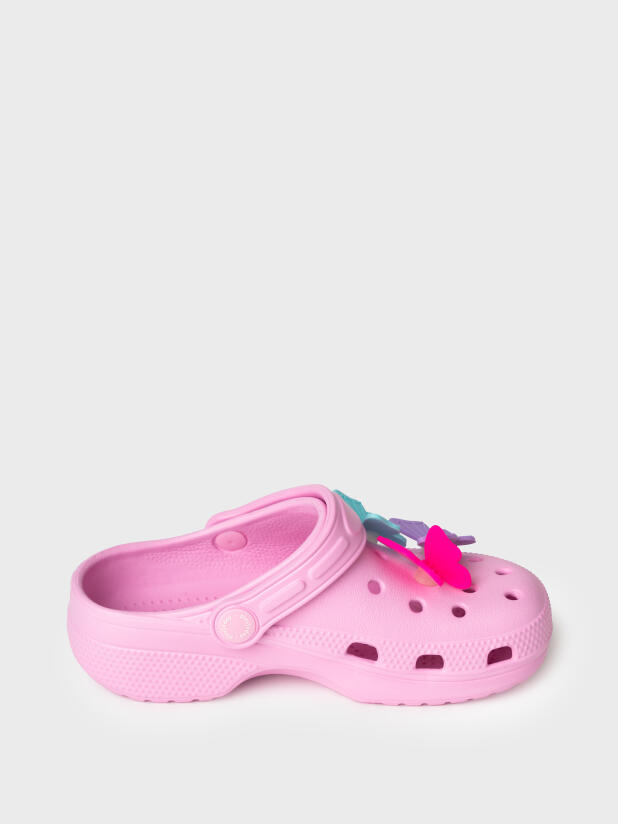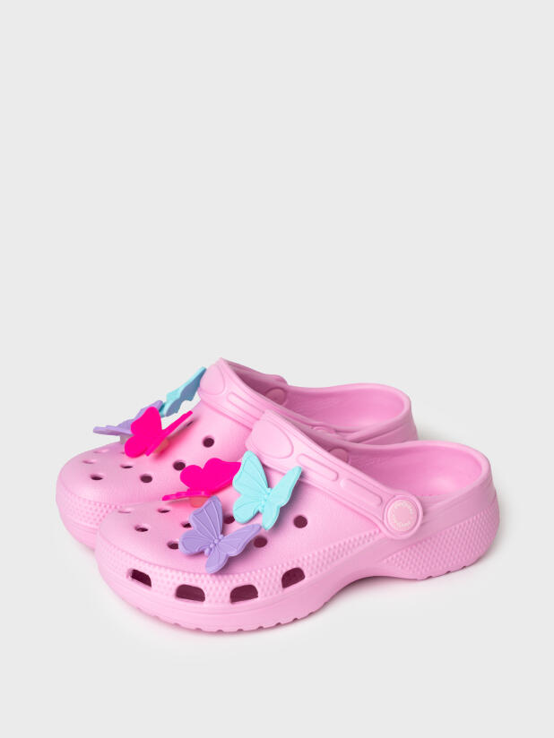 Сабо детские для девочки . Сабо из облегченного и прочного ЭВА. Материал хорошо моется. Модель декорирована объемными джибицами-бабочками. Форма модели учитывает эргономику стопы. Модель имеет перекидной ремешок для лучшей фиксации обуви на ноге. Благодаря вентиляционным отверстиям сабо проветриваются, ноги ребенка дышат и не потеют.