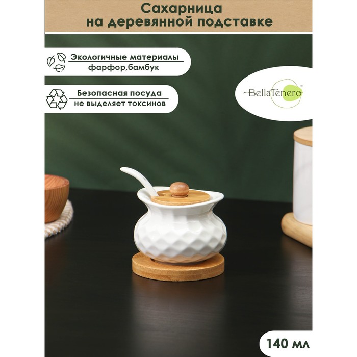 Габариты: 9,5 x 9,5 x 8 Страна: Китай В боксе: 36 набор Состав: Бамбук, фарфор Материалы: бамбук, фарфор Фасовка: по 1 набор Индивидуальная упаковка: Картонная коробка Габариты товара: 8,2 см × 8,2 см × 7,2 см Сертификат: СТР Набор: Да Цвет: Белый В наборе, шт.: 3 Объём, мл: 140 Тематика: Однотонная Рисунок: Нет Крышка: Да Материал крышки: Бамбук Материал: Фарфор Можно мыть в посудомоечной машине: Да Текстура: С рельефом Матовая поверхность: Нет Сахарница BellaTenero изготовлена из качественного фарфора. Кухонные изделия из фарфора отличаются прочностью и надёжностью, устойчивы к появлению царапин и резким перепадам температур. Благодаря оригинальному дизайну и причудливым формам сахарница с ложкой отлично впишется в интерьер вашей кухни и станет настоящей изюминкой при сервировке. В комплекте идёт устойчивая деревянная подставка. Комплектация