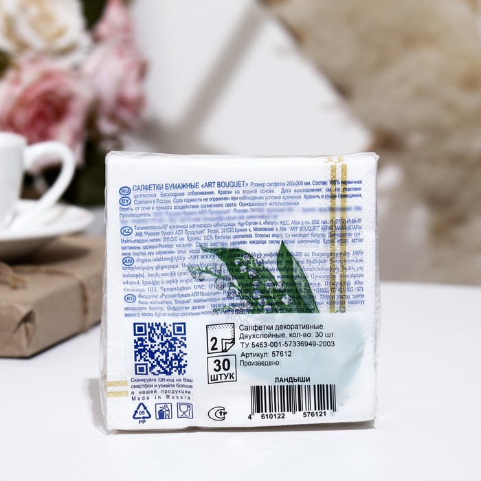 Производитель: АртБукет; Габариты: 2,5 x 10 x 10; Доставка: Платная; Страна: Россия; В боксе: 26 шт; Состав: См. на упаковке; Материалы: см. на упаковке; Фасовка: по 1 шт; Индивидуальная упаковка: Плёнка; Сертификат: СТР; Цвет: Разноцветный, Белый; Размер, см: 20 х 20; В наборе, шт.: 30; Фасовка, шт.: 30; Тематика: Цветочно-растительная; Символ года: Нет; Тематика праздника: 8 Марта; Материал: Целлюлоза; Тип бумаги: Двухслойная; Вид: С рисунком