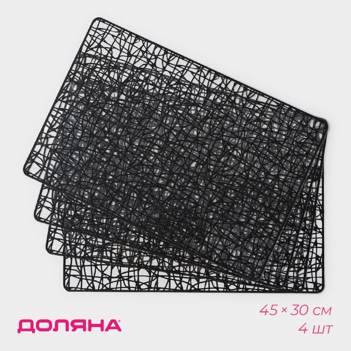 Производитель: Доляна; Габариты: 45,5 x 30,5 x 0,4; Страна: Китай; В боксе: 60 набор; Состав: ПВХ; Материалы: ПВХ; Фасовка: по 1 набор; Индивидуальная упаковка: Пакет; Габариты товара: 45 см × 30 см × 0,1 см; Сертификат: СТР; Набор: Да; Цвет: Чёрный; Размер, см: 30 х 45; В наборе, шт.: 4; Тематика: Однотонная; Рисунок: Да; Материал: ПВХ; Состав ткани: ПВХ; Особенности: Плетёные, Противоскользящие; Фактурные: Да