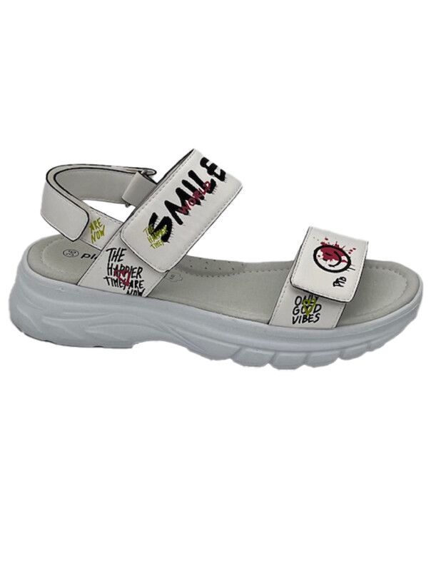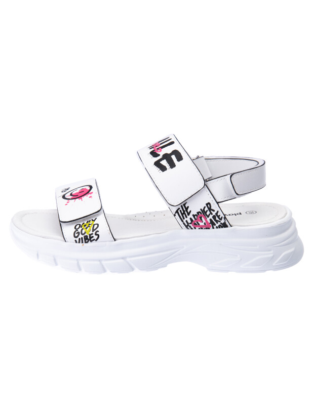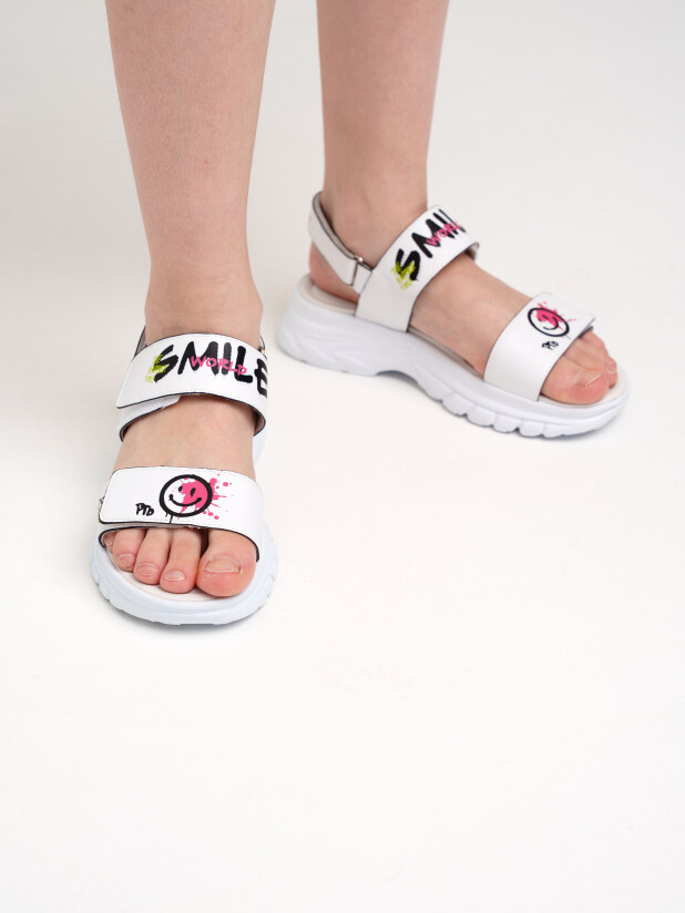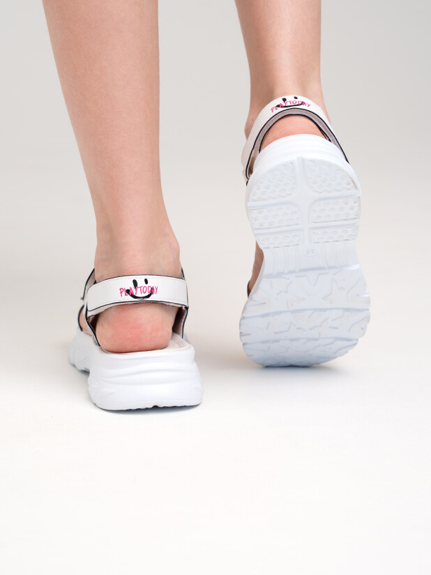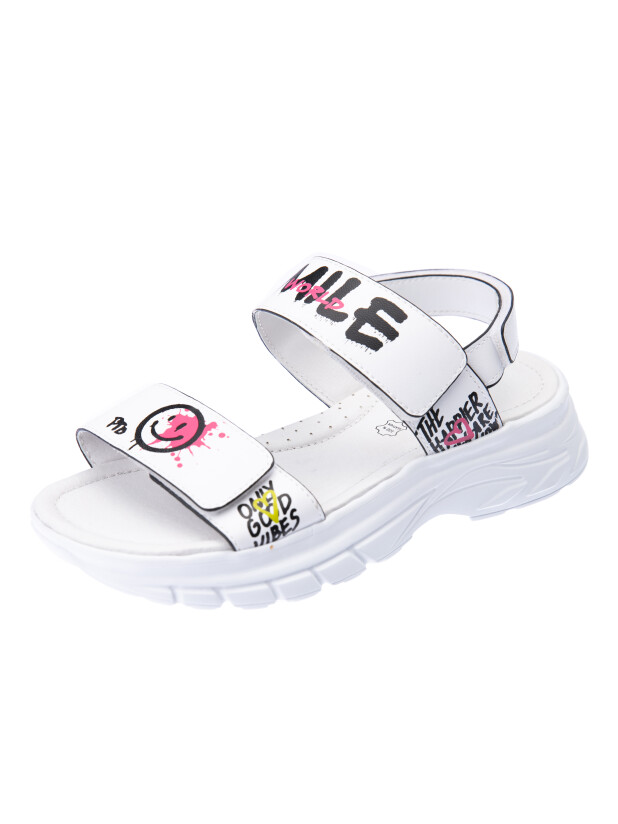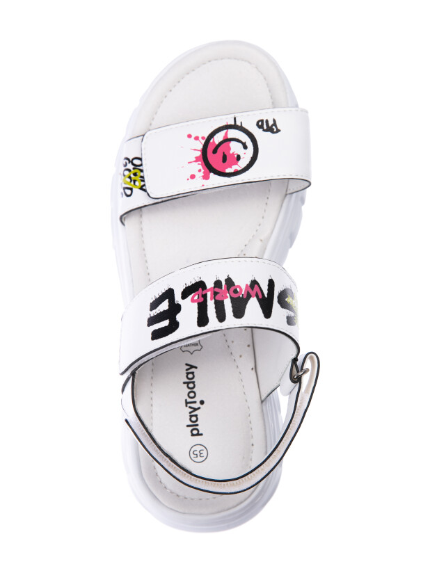 Сандалии из искусственной кожи. Облегченная подошва с противоскользящим протектором. Подкладка из натуральной кожи. Стелька из натуральной кожи с анатомическим элементом поддерживает свод стопы в правильном положении. Удобная застежка-липучка.
