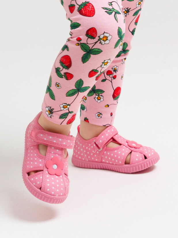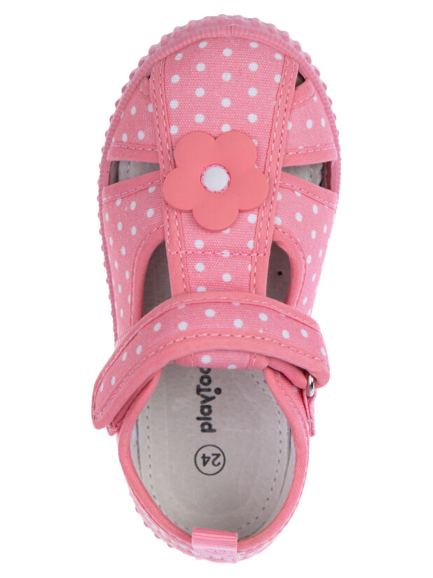 Сандалии из дышащего текстиля. Подкладка выполнена из 100% хлопка. Стелька выполнена из натуральной кожи и имеет анатомический элемент для поддержания свода стопы. Подошва из ПВХ легкая и гибкая.