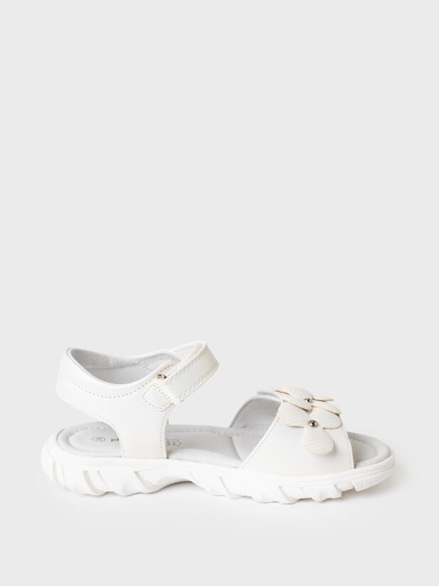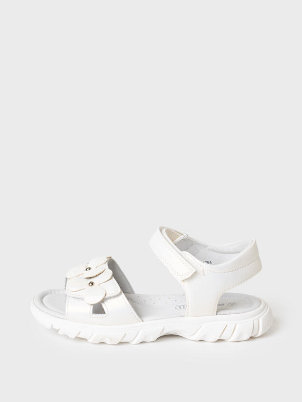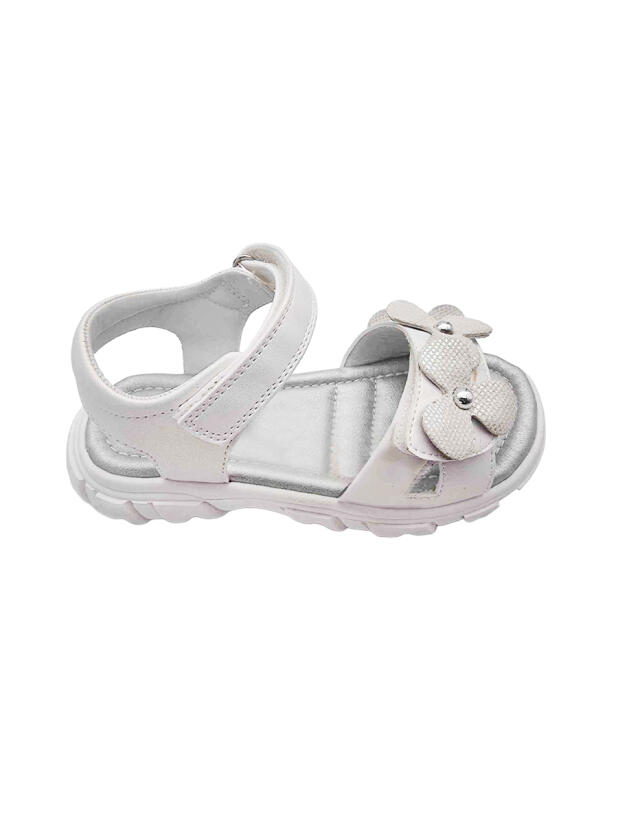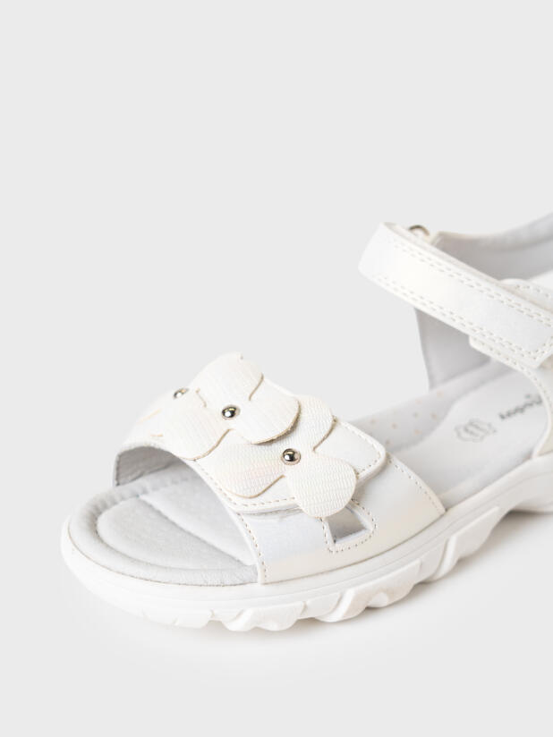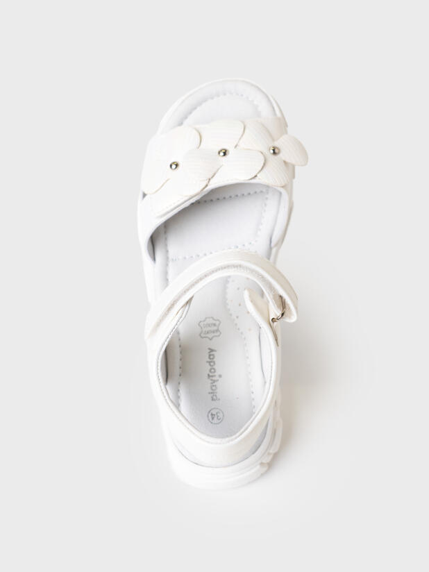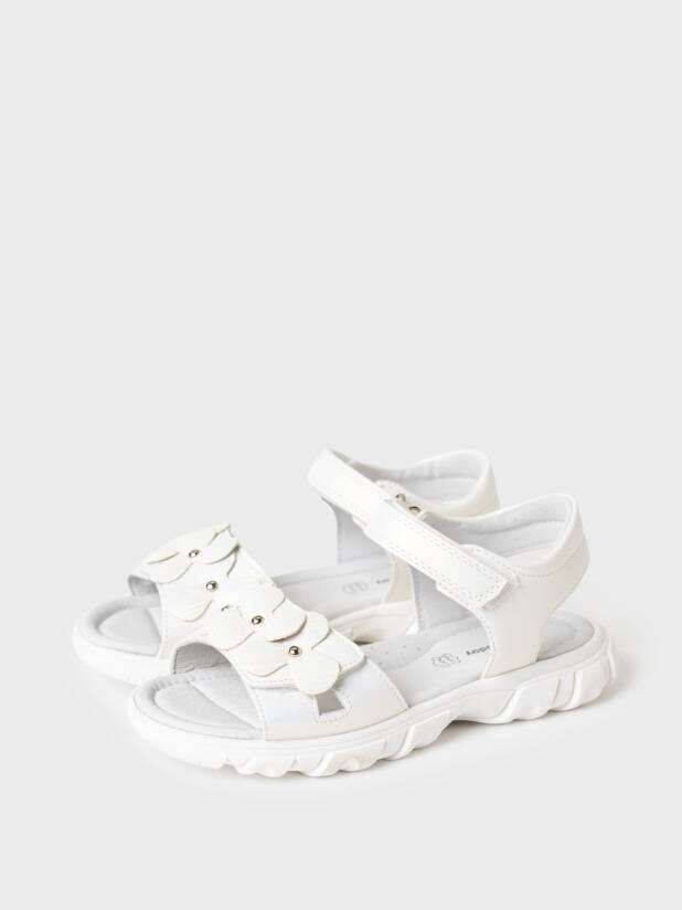 Нарядные белые сандалии для девочки. Босоножки выполнены из перламутровой искусственной кожи и декорированы крупными цветами. Удобные ремни с липучками позволяют регулировать обувь на любой подъем. Подкладка и стелька выполнена из натуральной свиной кожи. Стелька имеет анатомический элемент для поддержания свода стопы в правильном положении. Модель имеет гибкую и легкую подошва из ТПР с противоскользящим протектором.