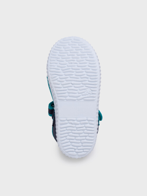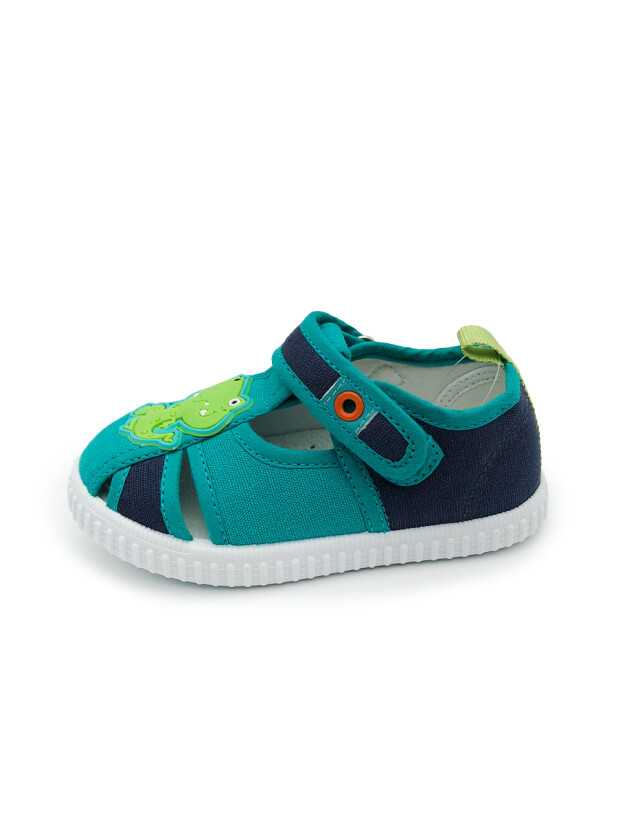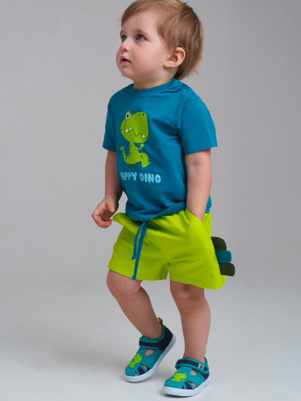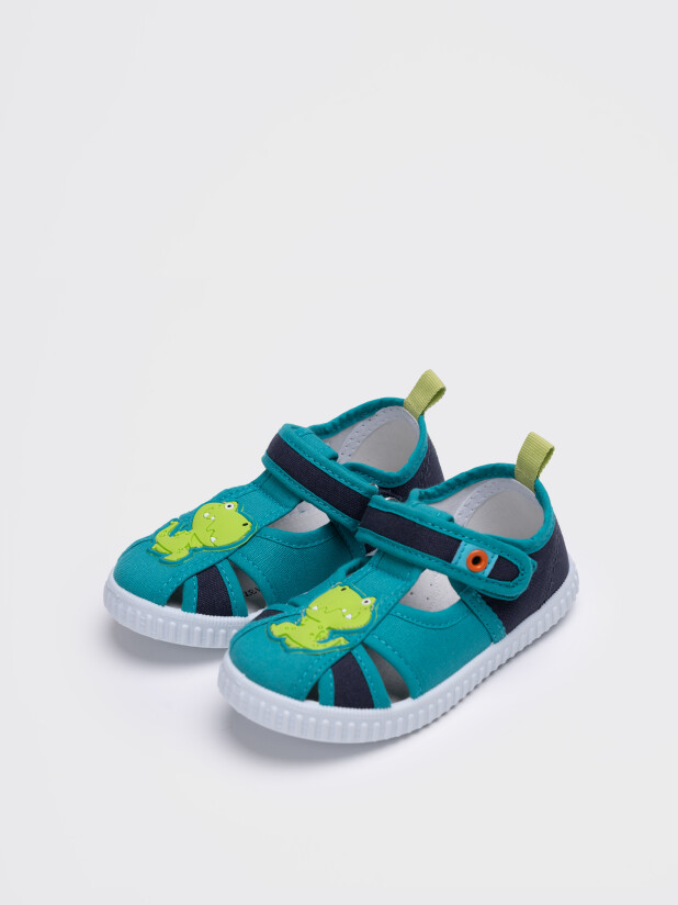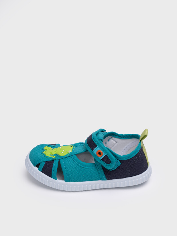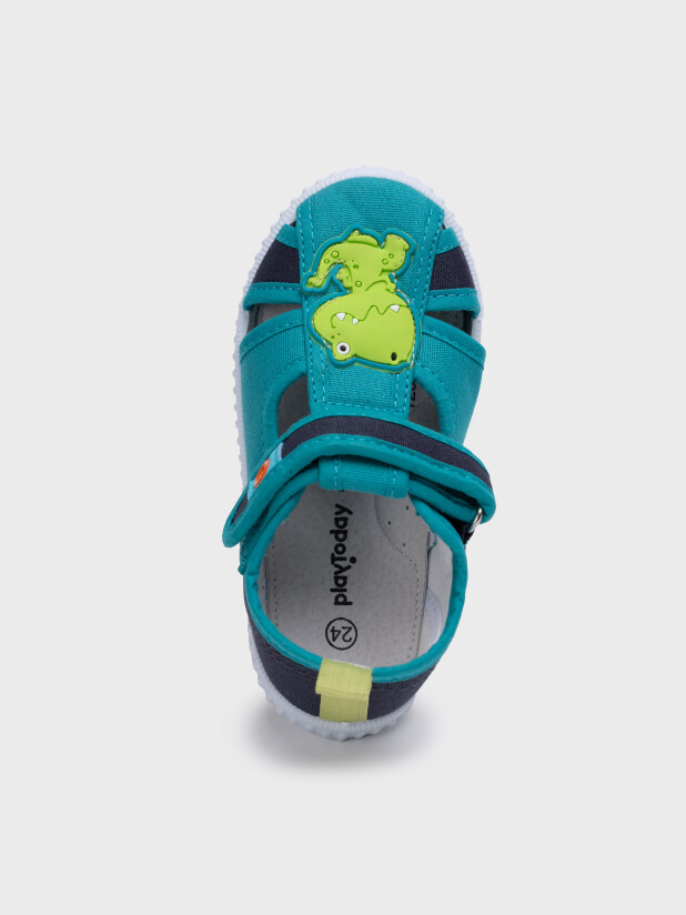 Сандалии детские для мальчика. Текстильные сандалии с закрытой пяткой с веселым динозавриком. Сандалии выполнены из дышащего текстиля с высоким содержанием хлопка 80%. Ремень с липучкой позволяет ребенку легко обуваться самостоятельно. Подкладка выполнена из 100% хлопка. Стелька выполнена из натуральной кожи и имеет анатомический элемент для поддержания свода стопы. Подошва из ПВХ легкая и гибкая.