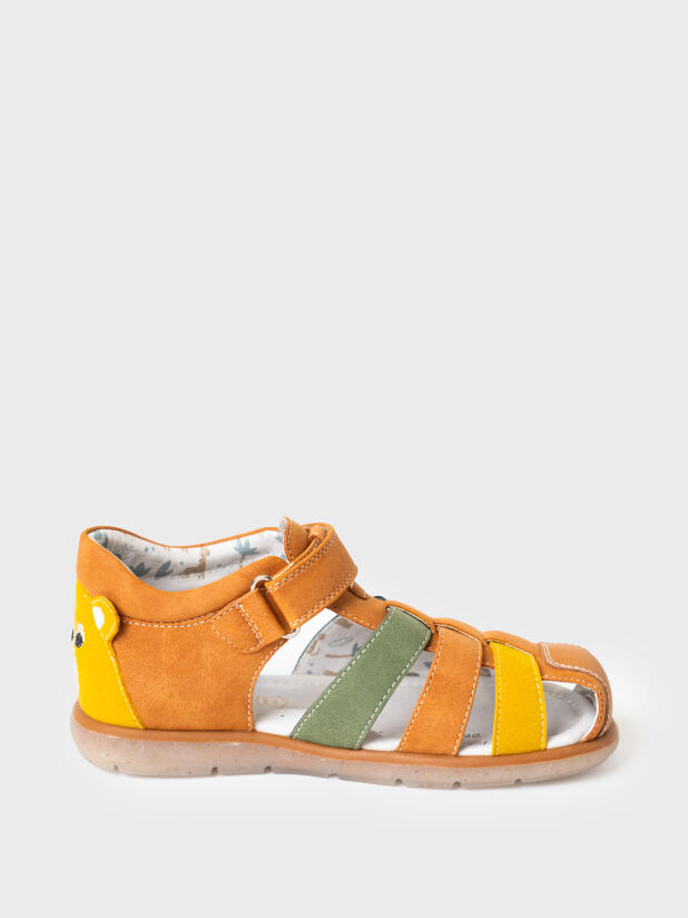 Сандалии для мальчика с закрытой носочной и пяточной частью выполнены из искусственного нубука. Сзади на пяточной части вышит симпатичный мишка. Удобный ремень с липучкой позволяют регулировать обувь на любой подъем и позволяют ребенку обуваться самостоятельно. Подкладка выполнена из принтованной натуральной свиной кожи. Стелька выполнена из натуральной свиной кожи и имеет анатомический элемент для поддержания свода стопы в правильном положении. Подошва из ТПР гибкая и нескользкая. Парфюмированная подошва имеет запах кокоса. Подошва в этой модели выполнена по новой экологической технологии - в составе подошве присутствую переработанные волокна кокоса.