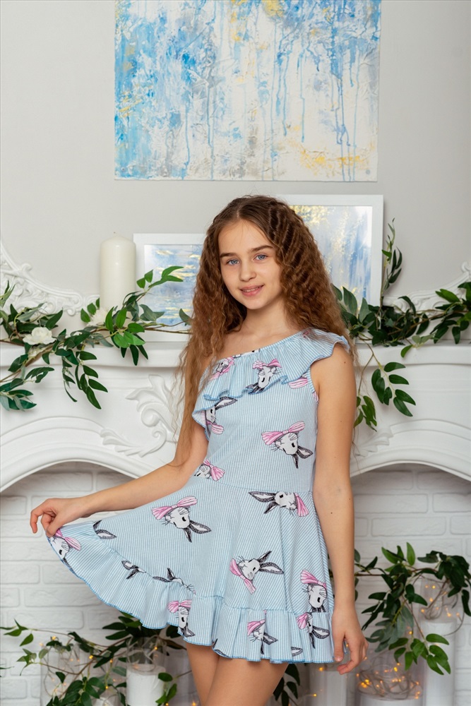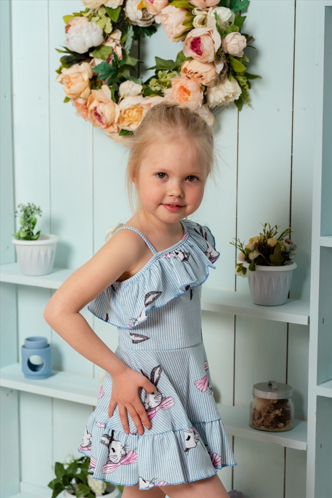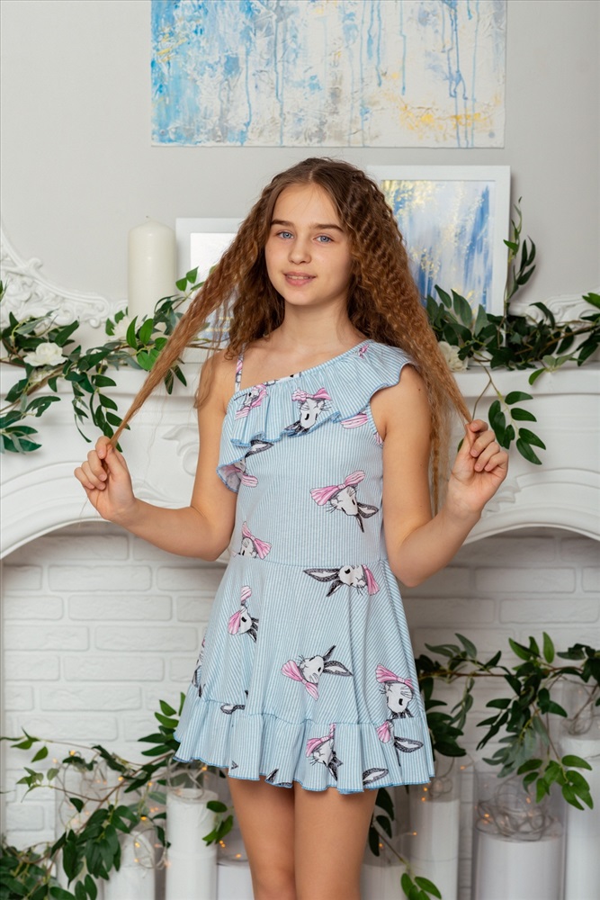 Сарафан детский летний для девочек приталенного силуэта. Верх сарафана оформлен пышной рюшей на одно плечо с тонкой бретелью, По линии талии притачена юбка с пышной оборкой. Срезы рюш обработаны декоративной краеобметочной строчкой.