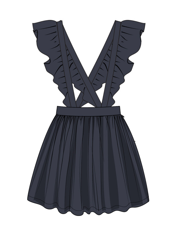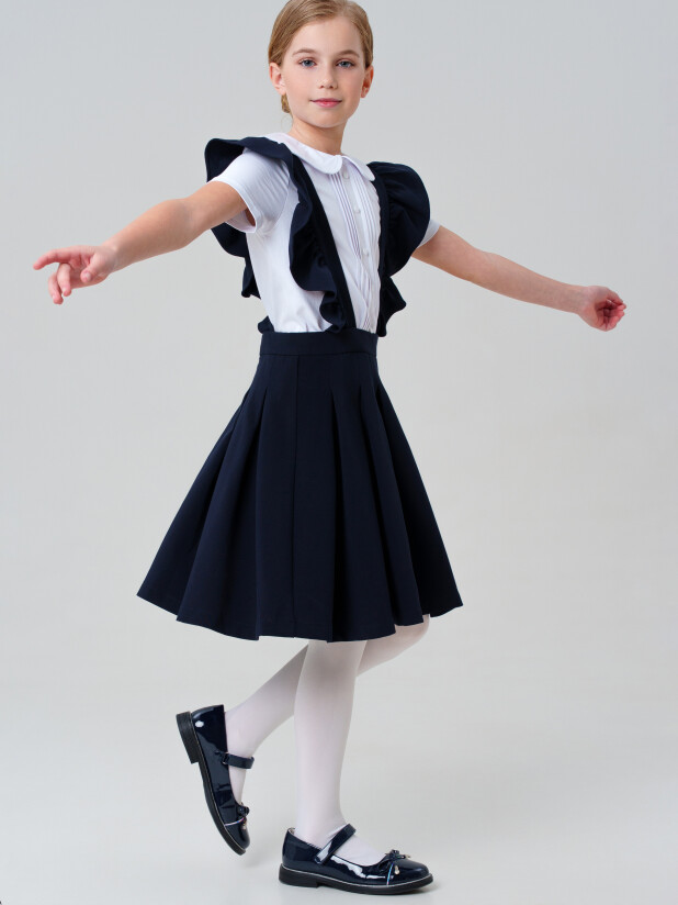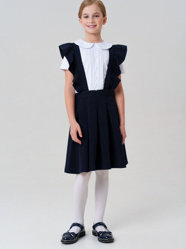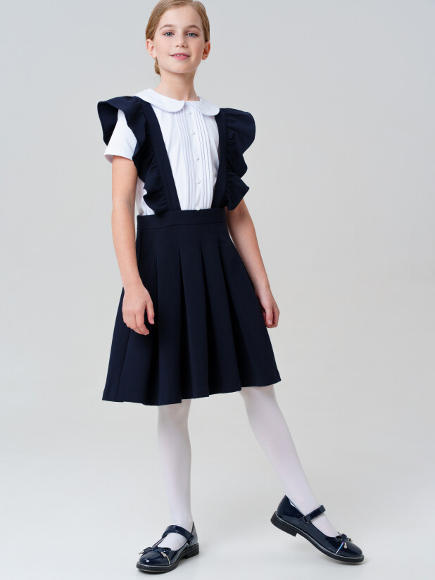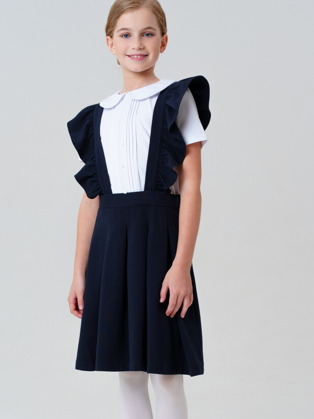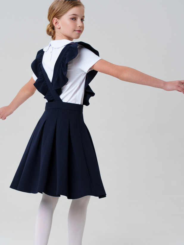 Такая модель с элегантным вырезом и прямым силуэтом легко комбинируется с рубашками, водолазками и блузками. Бретели крепятся на пуговицы и при желании могут быть сняты — вы получаете два стильных варианта школьной формы в одной модели.