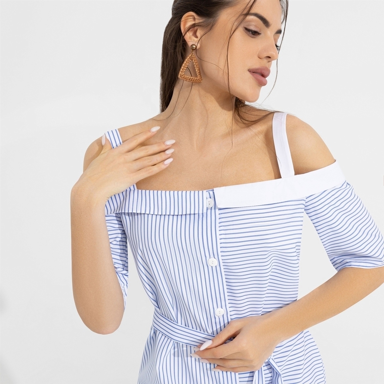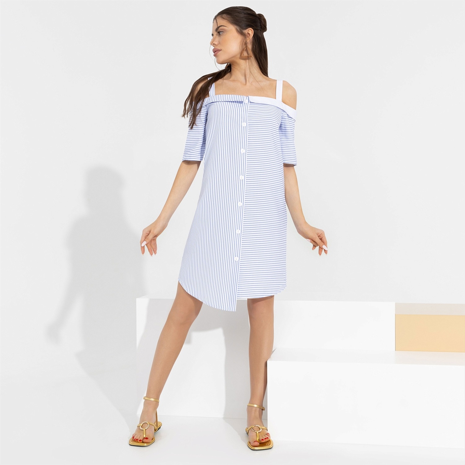 ТН ВЭД: 6204430000; Состав: «Полоска плательная», «поплин» (55% хлопок, 45% полиэстер); Плотность ткани: Средняя; Тип ткани: Текстиль; Вид застежки: Пуговица/-ы; Дополнительный цвет ткани: Белый; Карманы: Нет; Основной цвет ткани: Голубой; Отрезная талия: Нет; Подклад: Нет; Резинка по талии: Нет; Рисунок/раппорт: Каждое изделие уникально из-за расположения рисунка на ткани; Сезон: Лето