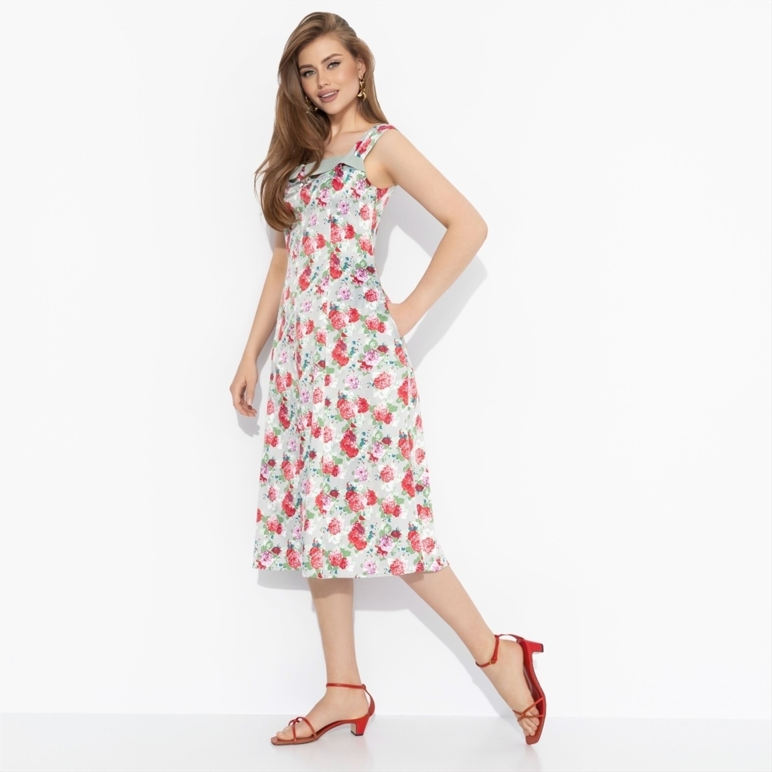 Проснуться от пения птиц, легкого ветерка из открытого окна и аромата свежеприготовленных пончиков. Атмосфера загородного дома пленит тебя с детства. Платье с цветочным узором ЧАРУТТИ поможет окунуться в любимый флер роскошных образов для легких прогулок. Приталенный силуэт, длина миди. Отвороты в зоне декольте. Широкие бретели в тон основного материала изделия. Есть карманы. Платье украшено пуговицами. Застегивается на скрытую молнию.