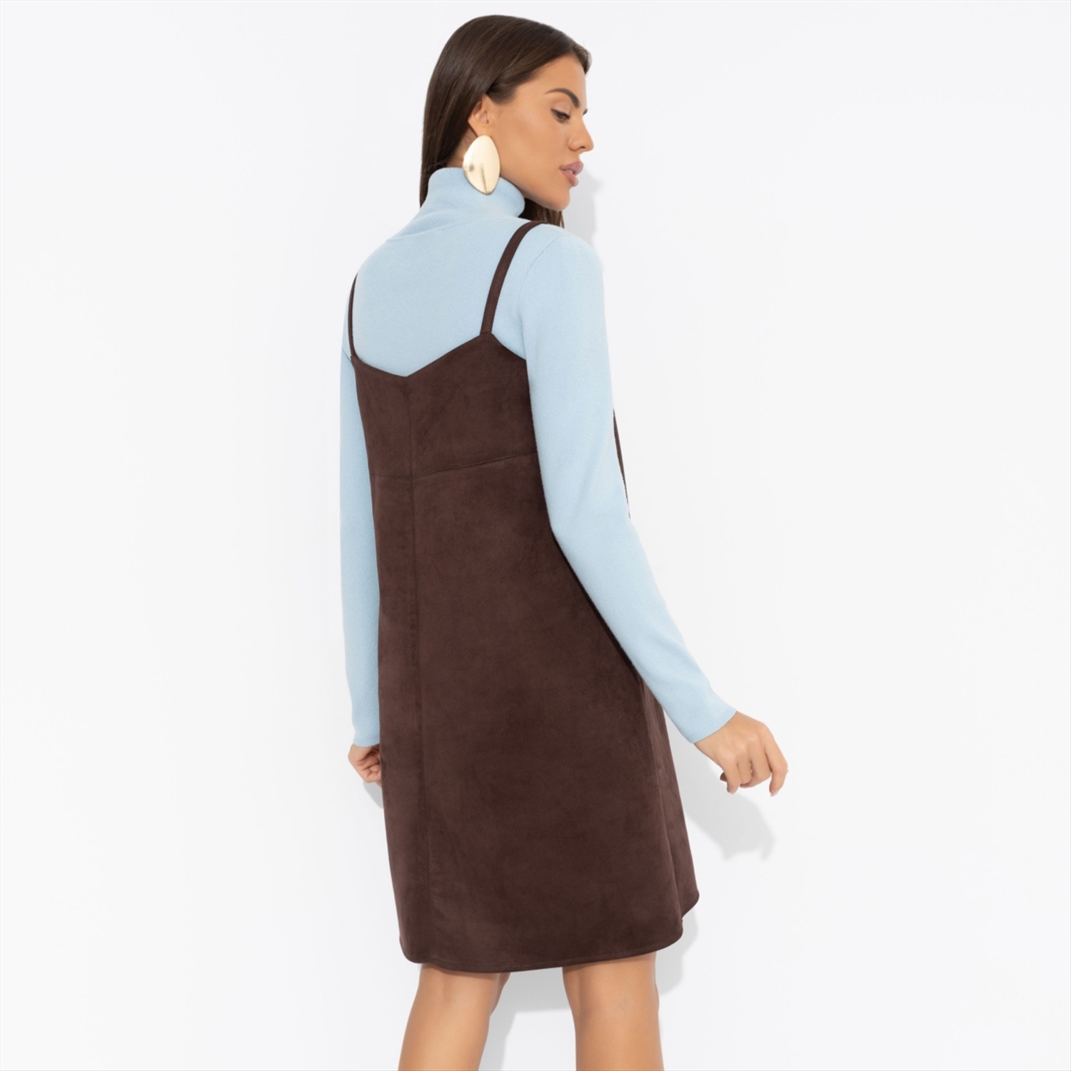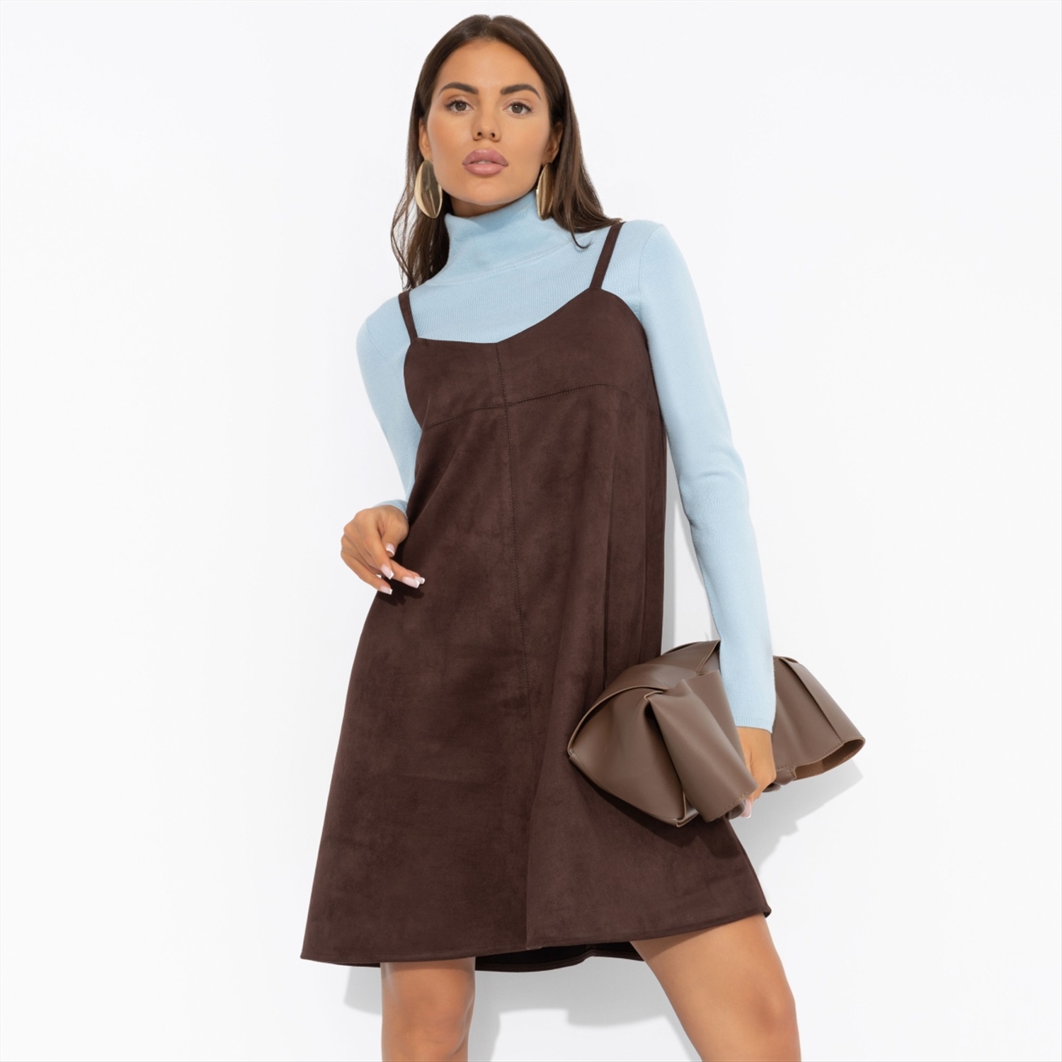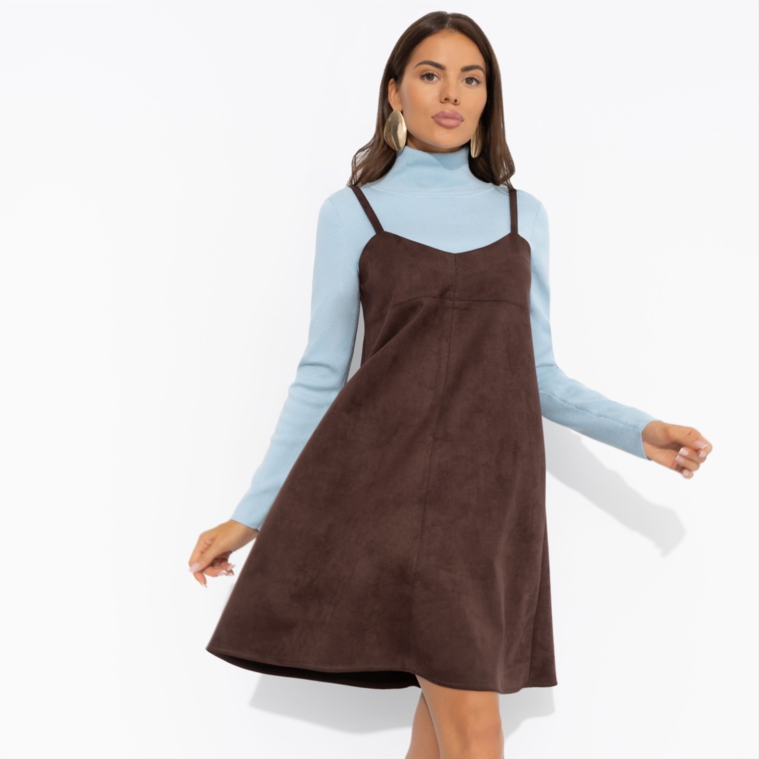 ТН ВЭД: 6204499000; Состав: Замша на скубе (95% полиэстер, 5% спандекс); Плотность ткани: Средняя; Тип ткани: Текстиль; Вид застежки: Нет; Карманы: Нет; Основной цвет ткани: Коричневый; Отрезная талия: Нет; Подклад: Нет; Резинка по талии: Нет; Рисунок/раппорт: Нет, все изделия идентичны; Сезон: Круглогодичный; Силуэт: Свободный; Стиль: Повседневный