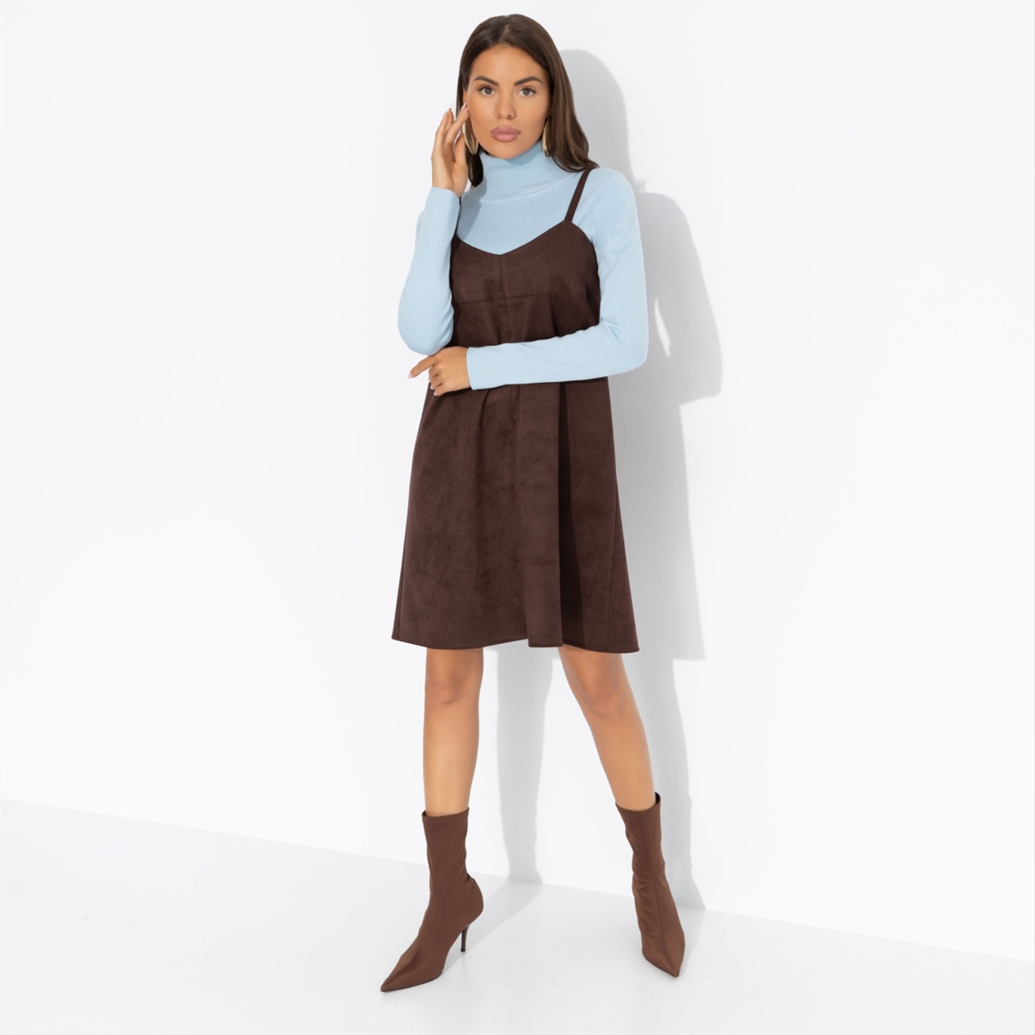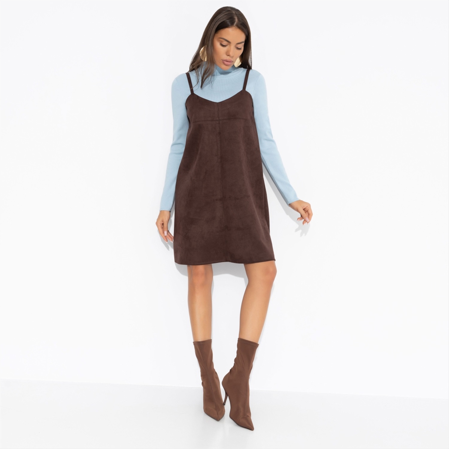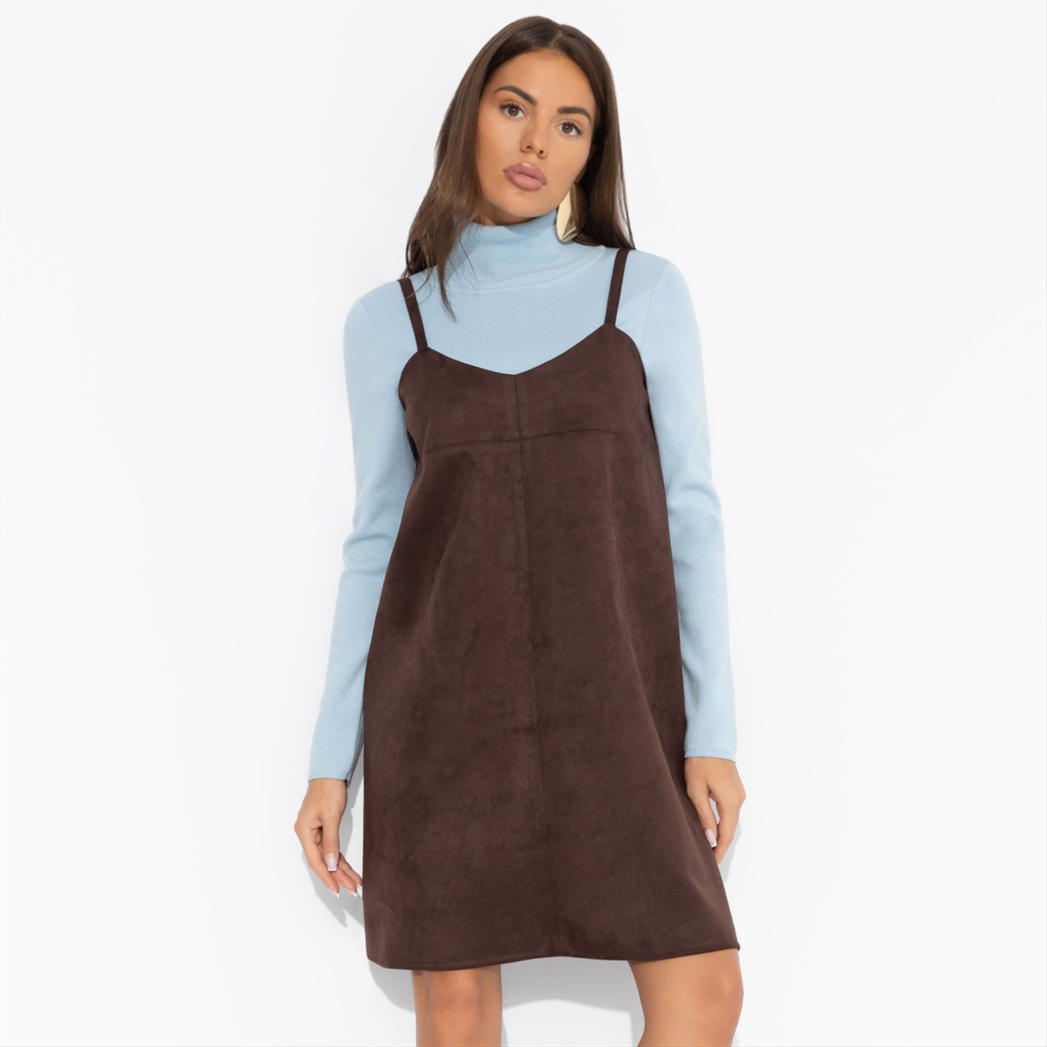 ТН ВЭД: 6204499000; Состав: Замша на скубе (95% полиэстер, 5% спандекс); Плотность ткани: Средняя; Тип ткани: Текстиль; Вид застежки: Нет; Карманы: Нет; Основной цвет ткани: Коричневый; Отрезная талия: Нет; Подклад: Нет; Резинка по талии: Нет; Рисунок/раппорт: Нет, все изделия идентичны; Сезон: Круглогодичный; Силуэт: Свободный; Стиль: Повседневный