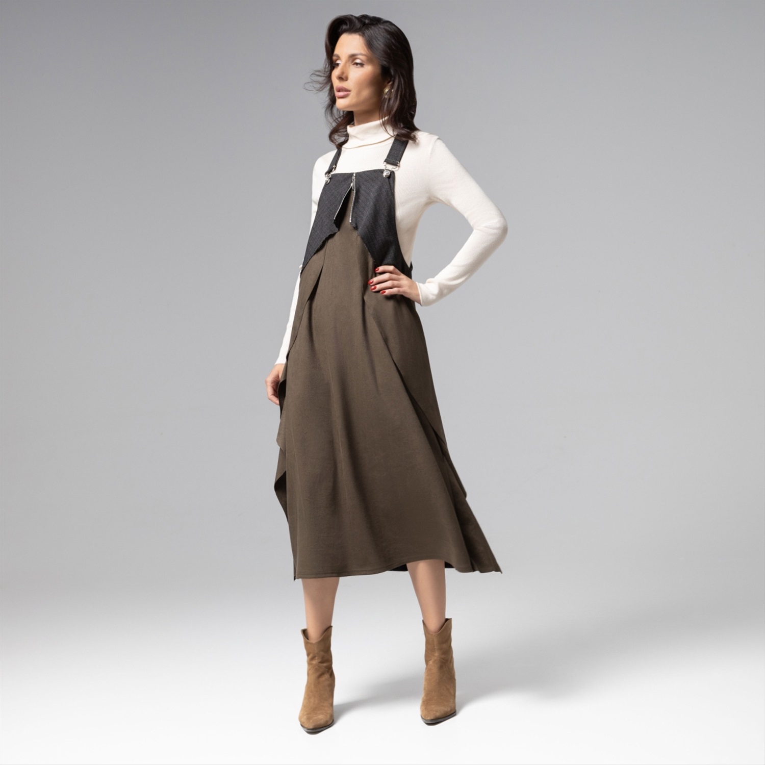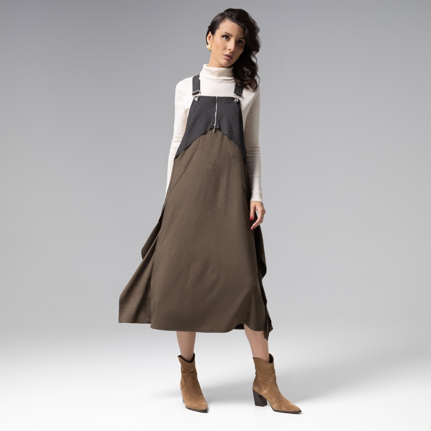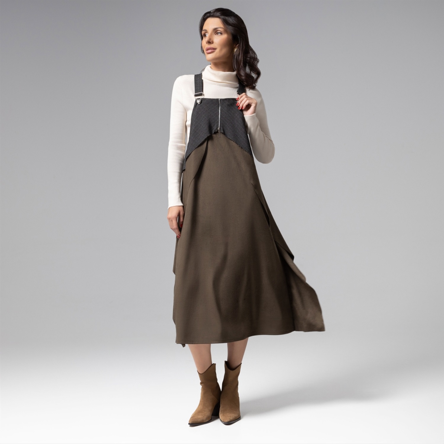Сарафан-миди в оттенках хаки: авангардная элегантность. Свободный новаторский крой, сочетающий трендовую экозамшу и костюмную ткань премиального качества, создаёт архитектурный силуэт со шлейфом восточной философии. Воздушные рюши по бокам подчёркивают игру света на сложной поверхности ткани. Сарафан ЧАРУТТИ представляет собой манифест роскошного casual, где комфортный крой встречается с нетривиальным дизайном.