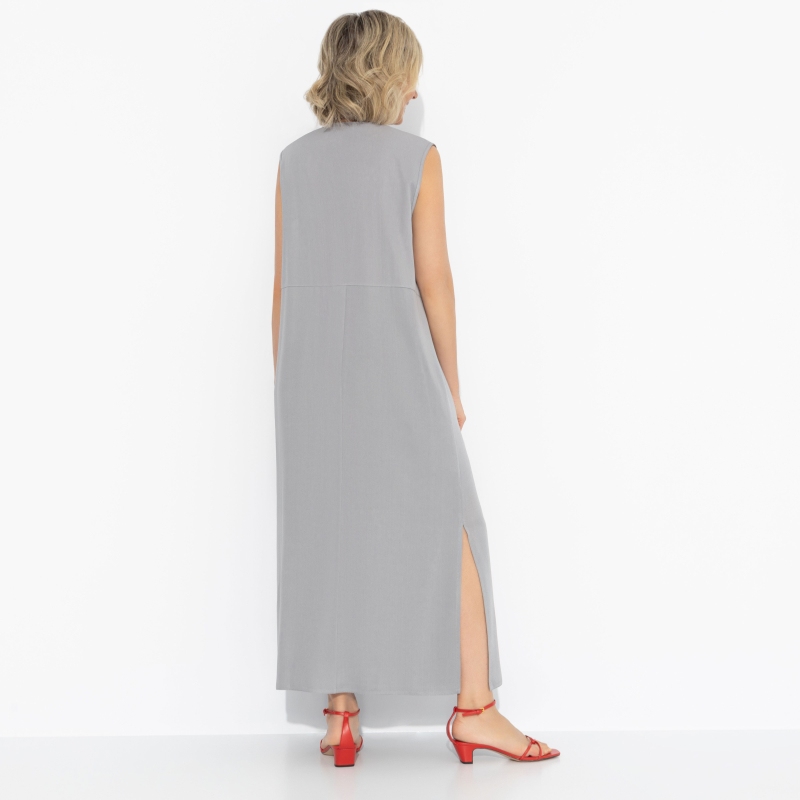 ТН ВЭД: 6204430000; Состав: «Твил» (65% п/э, 30% вискоза, 5% эластан); Плотность ткани: Тонкая; Тип ткани: Текстиль; Вид застежки: Нет; Дополнительный цвет ткани: Разноцветный; Карманы: Нет; Основной цвет ткани: Серый; Отрезная талия: Есть; Подклад: Нет; Резинка по талии: Нет; Рисунок/раппорт: Нет, все изделия идентичны; Сезон: Лето; Силуэт: Прямой; Стиль: Повседневный