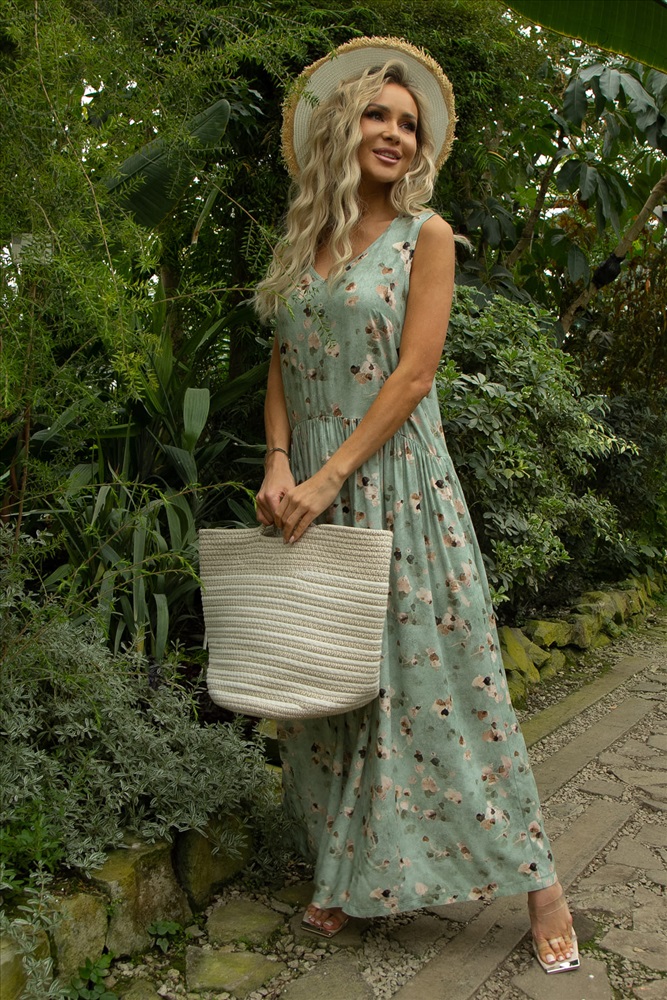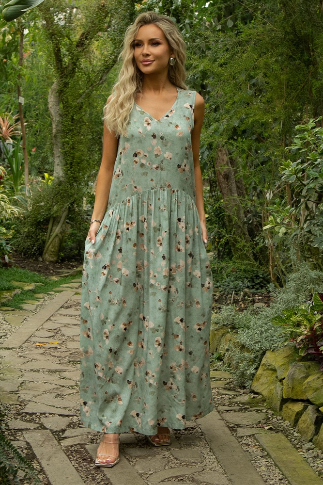 Платье свободного силуэта без рукавов идеально для теплых дней. Легкое и натуральное, оно гармонично сочетается как с каблуками, так и с кедами. Удобные боковые карманы позволяют носить с собой мелочи. Юбка собрана в драпировку, что даёт свободу в бёдрах и движении. Завершает образ V-образный вырез горловины.