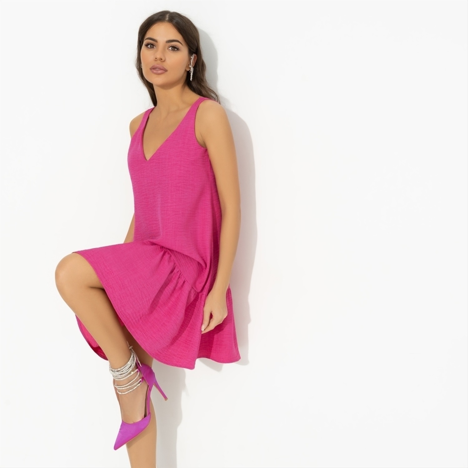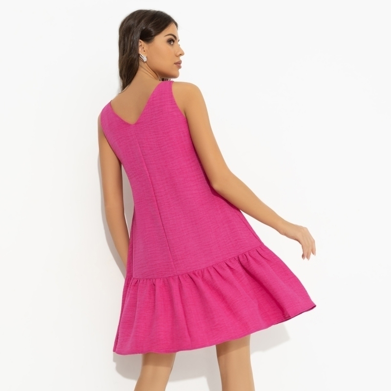 ТН ВЭД: 6204499000; Состав: «Аэролён» (80% п/э, 15% лен, 5% эластан); Плотность ткани: Тонкая; Тип ткани: Текстиль; Вид застежки: Нет; Карманы: Нет; Основной цвет ткани: Фуксия; Отрезная талия: Нет; Подклад: Есть; Резинка по талии: Нет; Рисунок/раппорт: Нет, все изделия идентичны; Сезон: Лето; Силуэт: Свободный; Стиль: Повседневный