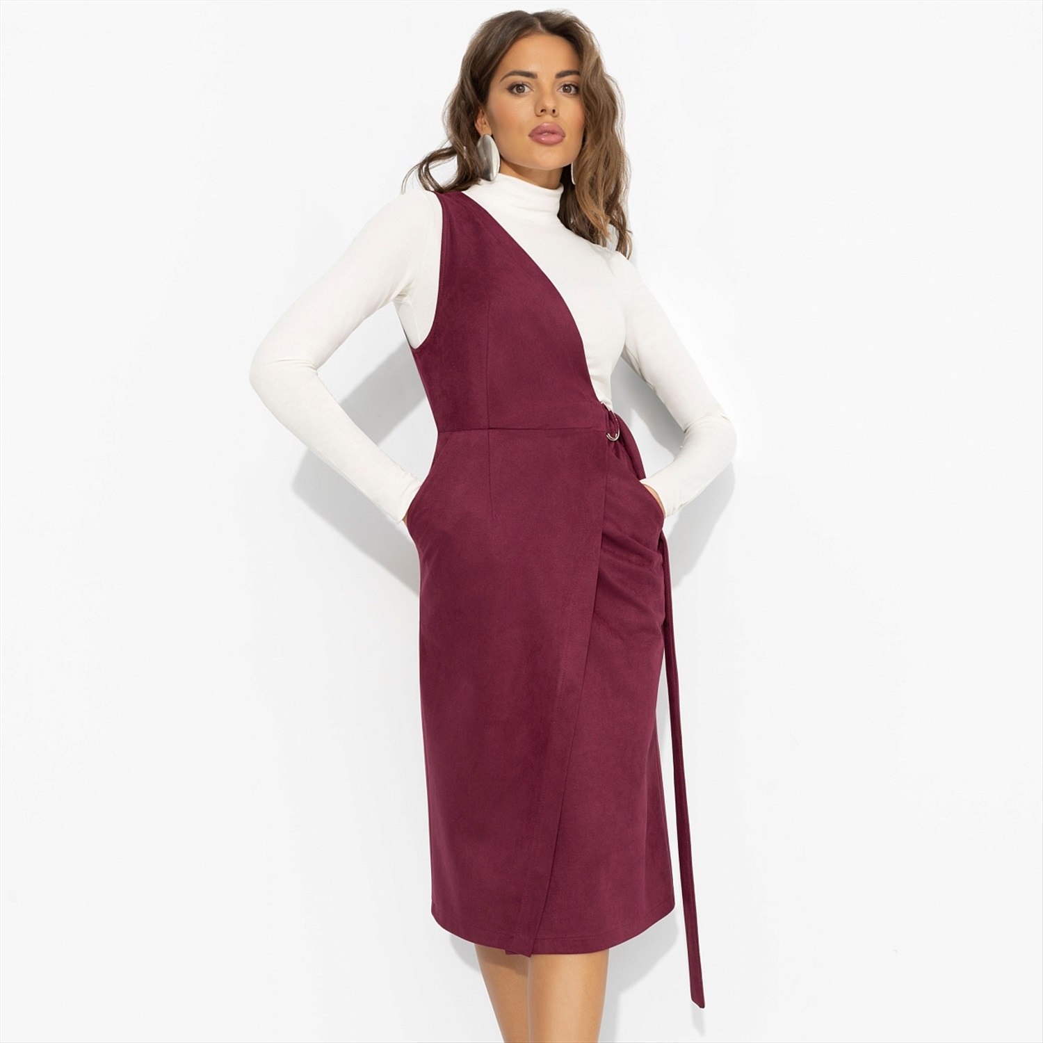 В этом сарафане ты будешь влюбляться в своё отражение много раз в день: сначала в зеркале лифта, потом – в витрине магазина по пути, и даже в стекле движущегося вагона метро. Глубокий бордовый оттенок, мягкая замша на скубе и асимметричный верх создают такой выверенный силуэт, что рука сама тянется за телефоном – фиксировать каждый ракурс. Сарафан миди с запахом и декоративным поясом подчёркивает талию и делает линии фигуры более стройными. Плотная, но пластичная замша на скубе держит форму и при этом комфортно облегает, превращая повседневный выход в маленькую фотосессию по пути из офиса в любимое кафе.