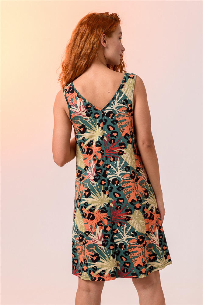 Сарафан трапецивидного силуэта, с V-образной горловиной спереди и сзади, длиной выше колена. Горловина и проймы обработаны бейкой из основного полотна.