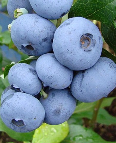 Мощные, плотные побеги голубики вырастают до 2 м. Ягоды созревают гроздьями, как у винограда, и впечатляют размером – до 2 см в диаметре и весом до 2,2 г. Светло-синяя кожица плотная, мякоть сочная и сладкая. Плоды созревают в конце июля – начале августа, отличаются сухим отрывом и хорошо хранятся. Уже на второй год после посадки можно ожидать урожай, и с каждым сезоном он становится все обильнее. Через три года с одного куста собирают до 7 кг ягод. Зимостойкость до −30 °С.