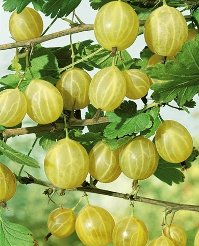 Ягоды овальные, без опушение, поверхность гладкая с легким восковым налетом. Несозревшие плоды зеленого цвета, в стадии биологической спелости желтые со светло-розовым фрагментом по бокам. Кожура прочная, тонкая. Мякоть зеленого цвета. Масса ягод на кусте неравномерная от 4 г до 7 г.