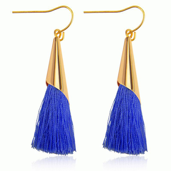 Красивые серьги с кисточками, колпачки "конус" золотого цвета. SE048-2 Серьги - кисточки Конус 75мм, цвет синий оптом