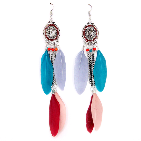 Красивые серьги в стиле "Ловец снов" с цветными перьями. SE101-1 Цветные серьги с перьями 14см оптом.