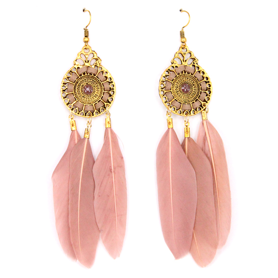 Красивые серьги в стиле "Ловец снов" с цветными перьями. SE102-1 Светло-коричневые серьги с перьями 10см оптом.