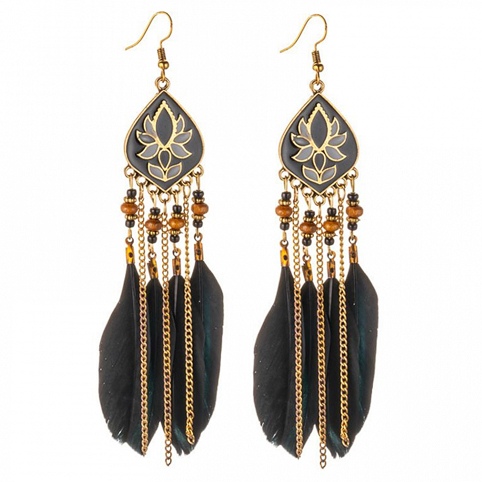 Красивые серьги в стиле "Ловец снов" с цветными перьями. SE112-3 Серьги с перьями Лотос 11см чёрные оптом.