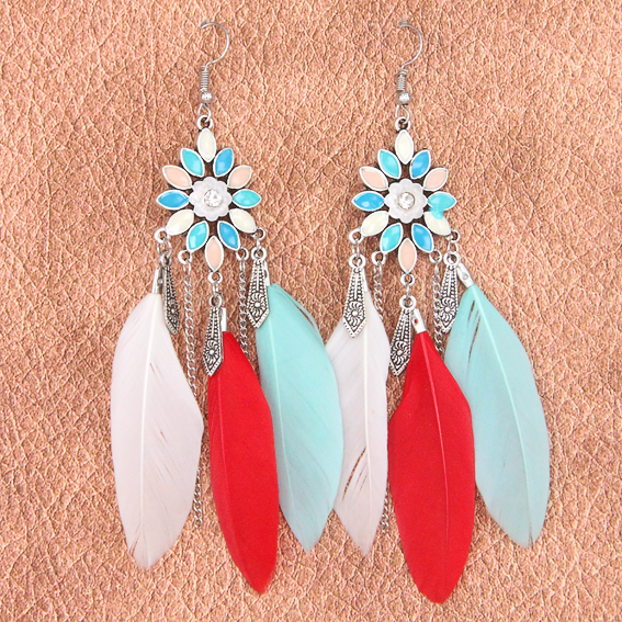 Красивые серьги в стиле "Ловец снов" с цветными перьями. SE122-1 Серьги Лотос с перьми 9см цветные оптом.