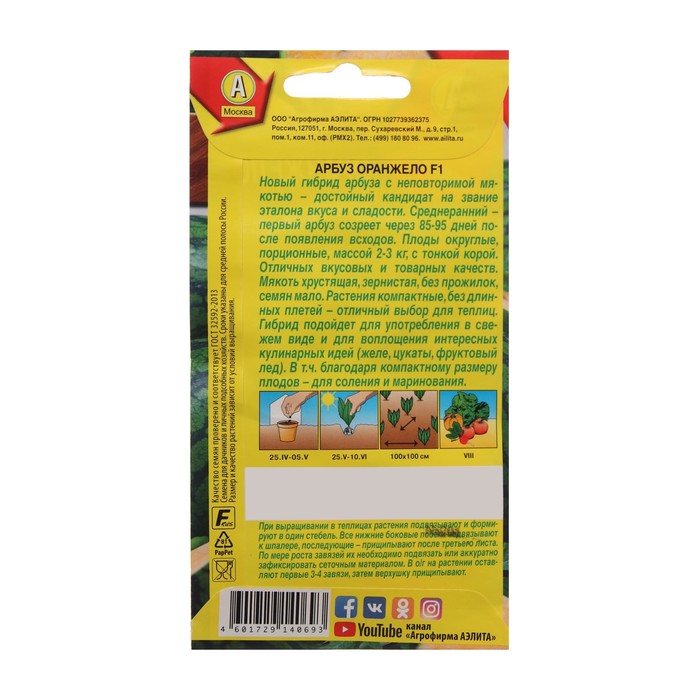 Производитель: Агрофирма АЭЛИТА; Габариты: 15 x 8 x 0,1; Страна: Россия; В боксе: 100 шт; Состав: См. на упаковке; Материалы: см. на упаковке; Фасовка: по 1 шт; Индивидуальная упаковка: Без упаковки; Сертификат: Не подлежит сертификации; Цвет: Зелёный; Агрономический срок годности, лет: 7; Сроки созревания: Ранний; Упаковка: Цветная; Особенности выращивания: Универсальный; Урожай: Август - Сентябрь; Окрас мякоти плода: Оранжевый; Сорт: F1; Ампельные: Нет; Вьющиеся (лианы): Да; Вид: Семечки; Нуждаются ли в стратификации: Нет