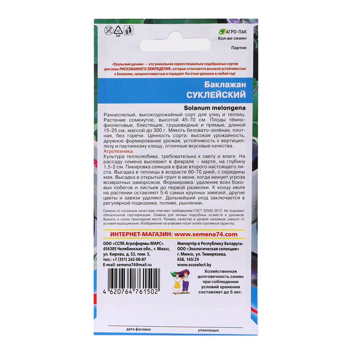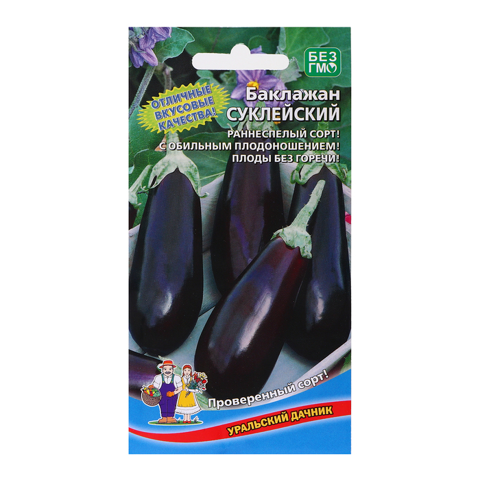 Производитель: Уральский Дачник; Габариты: 15 x 8 x 0,2; Страна: Россия; В боксе: 600 шт; Состав: Семена, см. на упаковке; Материалы: семена, см. на упаковке; Фасовка: по 2 шт; Индивидуальная упаковка: Без упаковки; Сертификат: Не подлежит сертификации; Агрономический срок годности, лет: 3; Сроки созревания: Средний; Особенности выращивания: Открытый грунт; Сорт или гибрид: Сорт; Сорт: Суклейский; Цвет плода: Фиолетовый