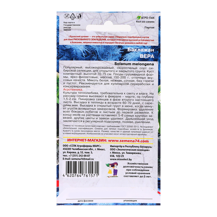 Производитель: Уральский Дачник; Габариты: 15 x 8 x 0,2; Страна: Россия; В боксе: 600 шт; Состав: Семена, см. на упаковке; Материалы: семена, см. на упаковке; Фасовка: по 2 шт; Индивидуальная упаковка: Без упаковки; Сертификат: Не подлежит сертификации; Агрономический срок годности, лет: 3; Сроки созревания: Средний; Особенности выращивания: Открытый грунт; Сорт или гибрид: Сорт; Сорт: Вера; Цвет плода: Фиолетовый