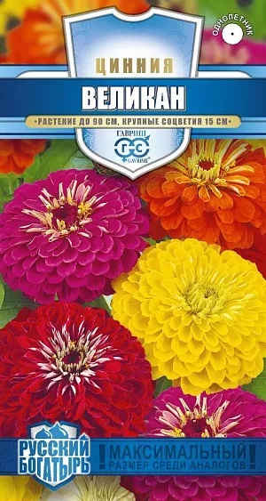 Смесь высокорослых крупноцветковых цинний для элитного оформления сада. Серия «Исполин» отличается чрезвычайно обильным и продолжительным цветением, прочными ветвящимися цветоносами, чистыми и стойкими к выгоранию тонами соцветий. Формирует приподнятые, разветвленные кусты высотой до 90 см. Соцветия георгиновидные, крупные, различных тонов, 15 см в диаметре, с высокой устойчивостью к неблагоприятным погодным условиям. Цветет с июня до заморозков. Циннии светолюбивы, засухоустойчивы и теплолюбивы; отзывчивы на полив, без длительного полива снижается интенсивность цветения и уменьшается размер соцветий. Выращивают рассадным способом. Семена высевают в апреле. Всходы появляются через 4-6 дней. В начале июня растения высаживают на расстоянии 20 см.