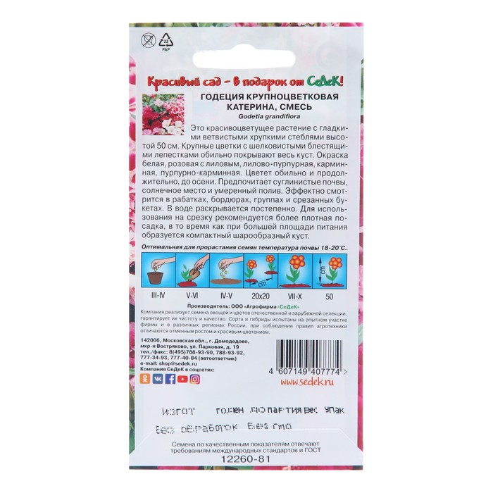 Производитель: СеДеК; Габариты: 15 x 8 x 0,1; Страна: Россия; В боксе: 600 шт; Фасовка: по 3 шт; Индивидуальная упаковка: Без упаковки; Сертификат: Не подлежит сертификации; Цвет: МИКС; Агрономический срок годности, лет: 5; Вегетация: Однолетники; Вид: Годеция; Особенности выращивания: Открытый грунт; Сухоцвет: Нет; Махровые: Нет; По форме куста: Кустовая; Назначение: Для создания цветников, клумбы; Отношение к свету: Светолюбивые; Разновидность: Цветущее; Нуждаются ли в стратификации: Нет Наша коллекция семян включает как популярные овощи, так и яркие цветы, идеально подходящие для вашего сада. С нами вы сможете наслаждаться богатым урожаем и великолепием цветения в любое время года. Данные семена идеально подойдут для выращивания в вашем саду.