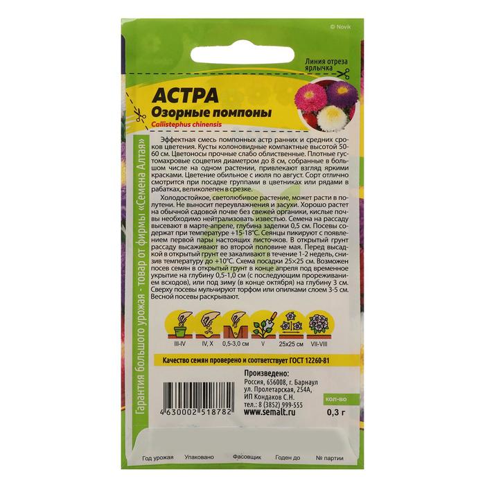 Производитель: Семена Алтая; Габариты: 15 x 8 x 0,1; Страна: Россия; В боксе: 300 шт; Состав: См. на упаковке; Материалы: см. на упаковке; Фасовка: по 1 шт; Индивидуальная упаковка: Без упаковки; Сертификат: Не подлежит сертификации; Цвет: МИКС; Агрономический срок годности, лет: 5; Вегетация: Однолетники; Вид: Астра; Особенности выращивания: Открытый грунт; Сухоцвет: Нет; Махровые: Да; По форме куста: Кустовая, Ампельная; Назначение: Для создания цветников, клумбы; Отношение к свету: Светолюбивые; Разновидность: Цветущее; Нуждаются ли в стратификации: Нет